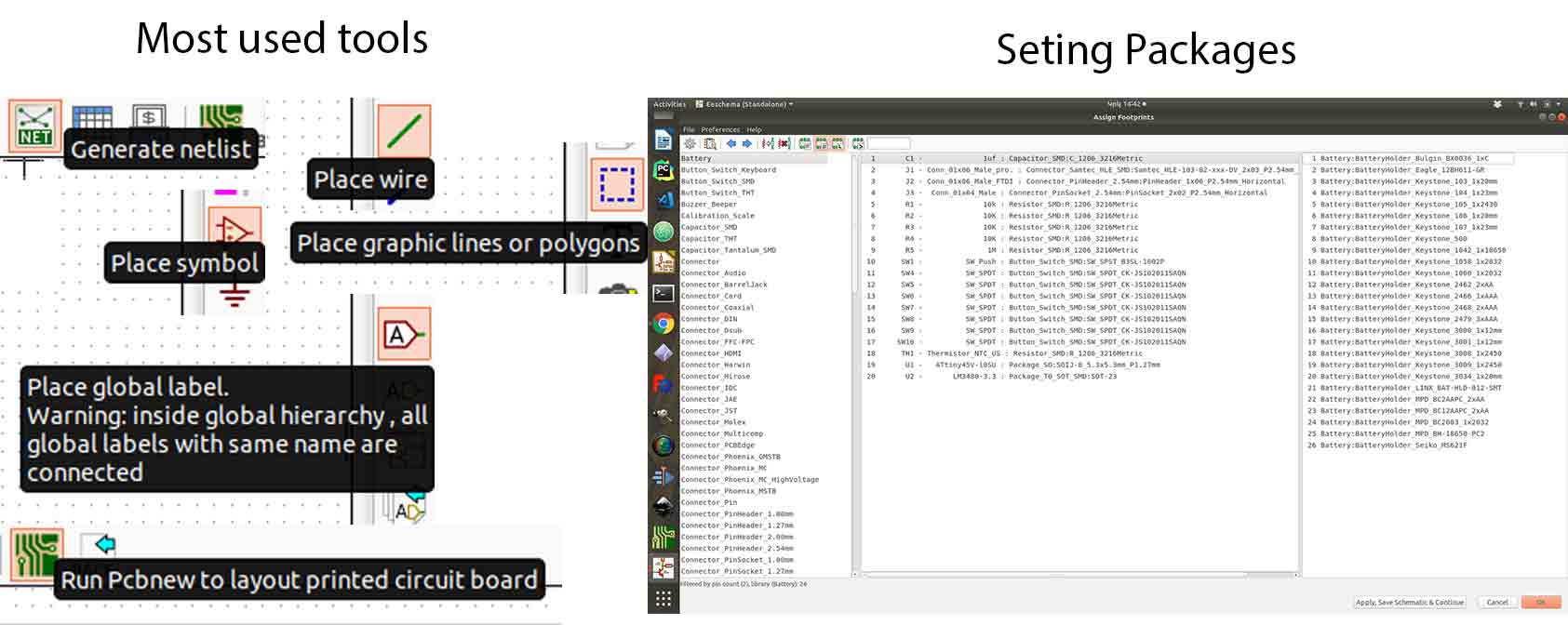 After checking all symbols, values, numbers, and connection between parts you can assign footprints for each part (choosing package) by going to “Tools > Assing Footprints”, after choosing a package for each component press “Apply, Save Schematics and Continue”.After click “Generate netlist” by clicking the icon on the top of the panel and finally you have done with schematics. You can go and start work on PCB layout if any problem appears you can go back to change and generate netlist again. If you what to know more how to draw schematics and reading datasheet go to week 7 “Electronics Design”.
