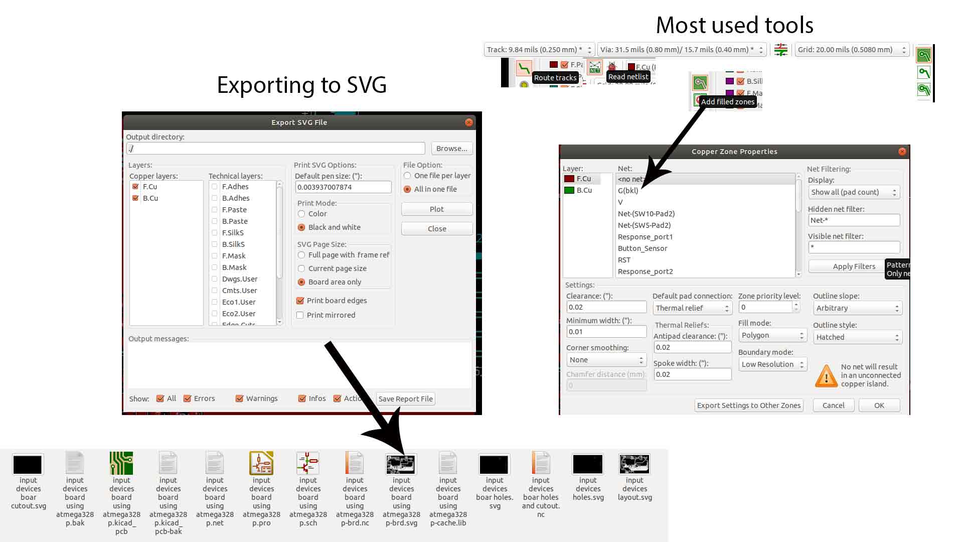 After connecting, the final step before exporting is to “Add Fill Zone ” by clicking the icon in the right corner of the panel and by choosing G(bkl), sketch outline and ground copper(at the same time it will do). And finally, you can export your board in .svg file format by going “File > Export > SVG…>(before clicking “Plot” .Print mode: choose Black and white, SVG Page size: Board area only, ) Plot ” it will save in the project folder.