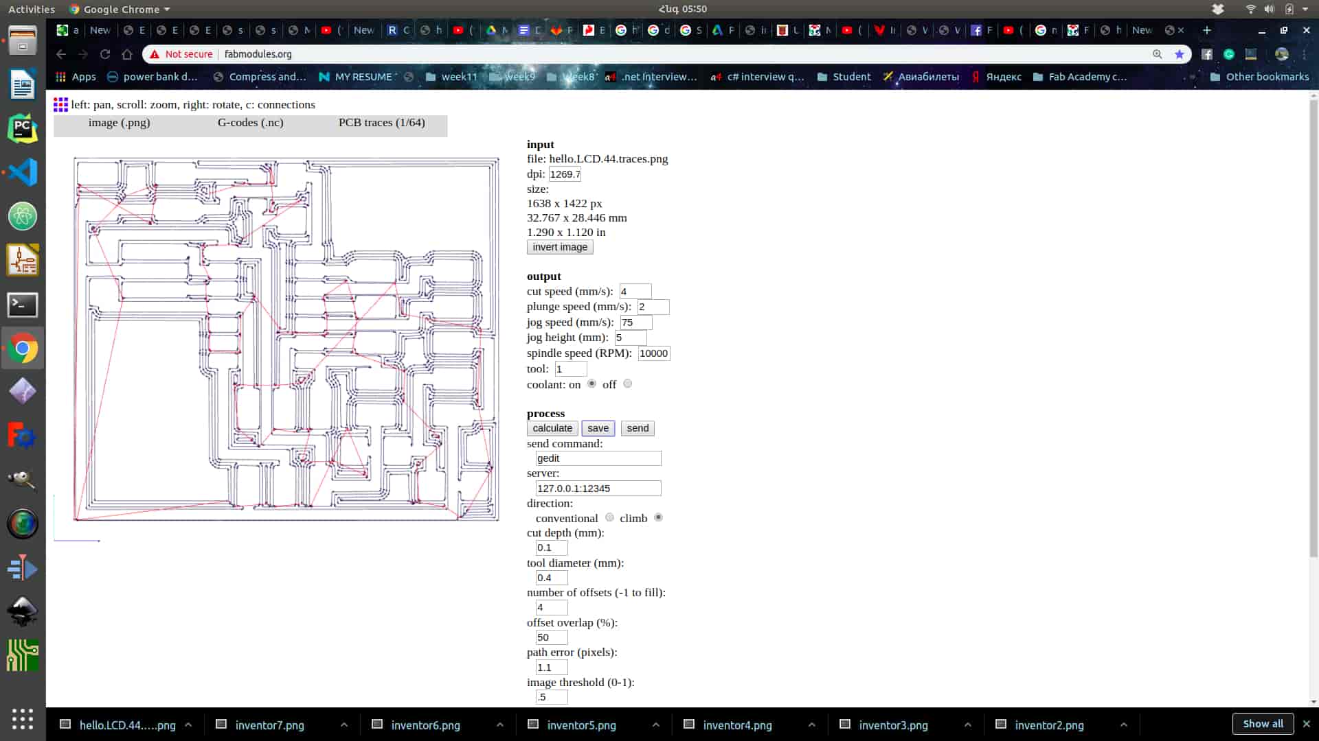 Choose export format of the file . This is important because it must be readable for your machine . In my case I chose G-Code format which is working with different kinds of machines including SRM- 20 .There is also .rml file format which is exactly for SRM-20 and MDX-40 . But I used .nc or in another words G-code format in any case if your machine is different of mine .Choose 1/64 inch tool for traces .Adjust the parameters .In my case I haven't changed anything , I calculated it by default parameters . So after looking through parameters press calculate and wait . Press “Save” and save somewhere .Restart the page choose outline image and choose 1/32 inch tool for it (the file format is the same .nc ) . You can change the parameters , but I prefer to save it by default . And after saving the you got 2 files one for layout and one for cutout .