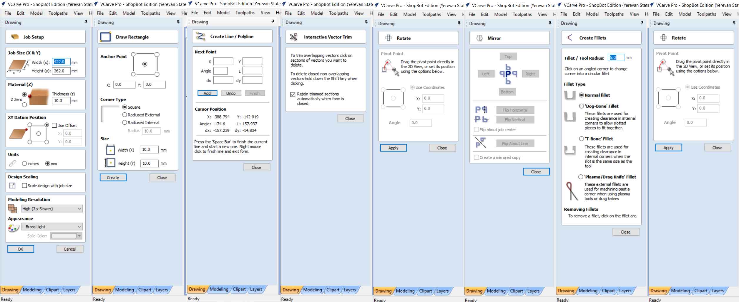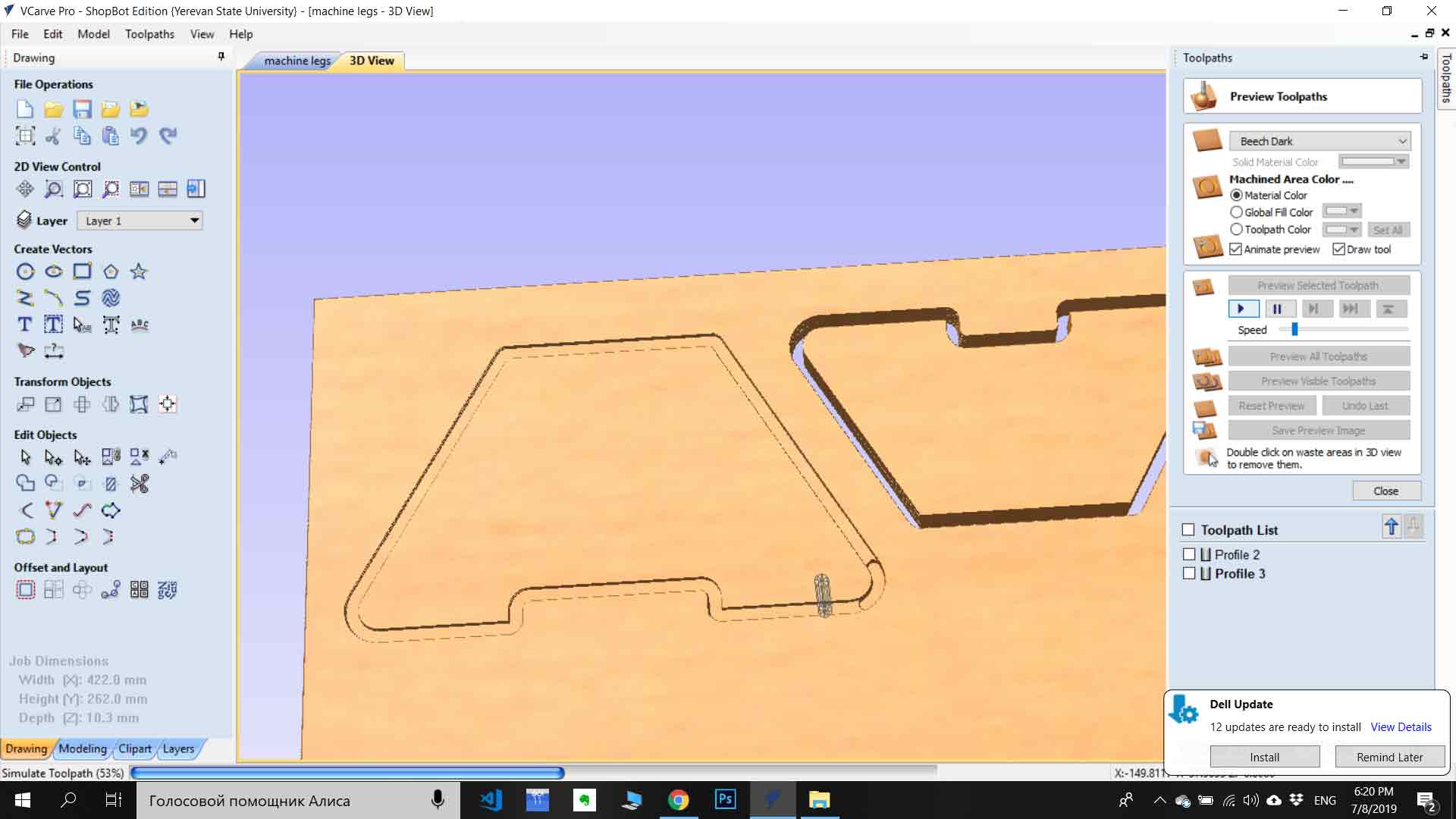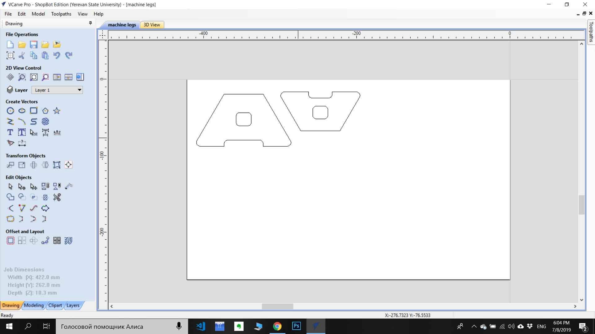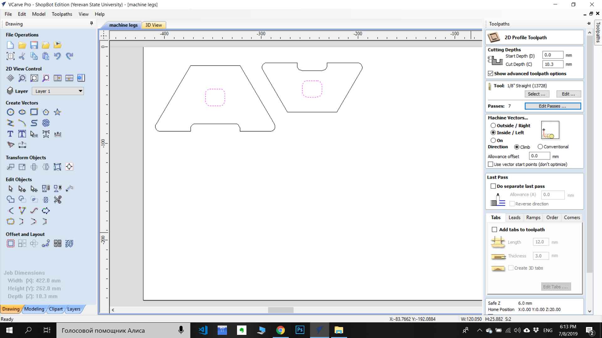 For the machine, I need to design legs for the rail of the machine. For this purpose, I used Vcarve Pro which very easy to use for simple applications also you can generate g code for ShopBot directly from softer by choosing parameters for the toolpath. I have drow simple 2D sketch for legs in rectangular forms with the hole in the middle. I drow 2 rectangular legs with different heights(because of different highs at ends of rail). After drawing I generated the toolpath and start cutting.