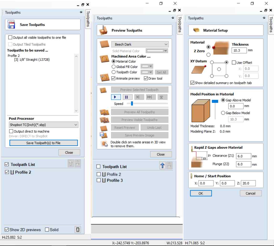 Also, I have added passes from 4 to 7(just for safety). After adjusting all parameters press calculate and observe 3D visualization on toolpath by using "Preview Toolpaths" tool in the Toolpaths section. After checking , go "Save toolpathes" and save the file somewhere by clicking "Save Toolpathes(s) to File"(it will generate g code for shopbot ). The same process is required to cut out(pocket).