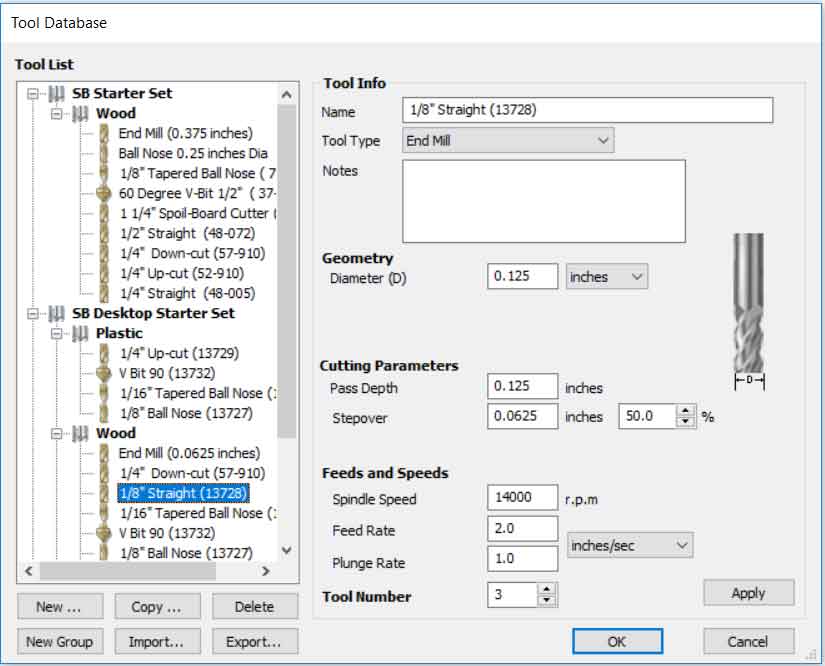 By choosing a tool, you and change parameters like Tool Type, Diameter, Pass Depth, Stepover, Spindel Speed (r.p.m), Feed Rate, Plunge Rate(inches.sec) in my case I chouse