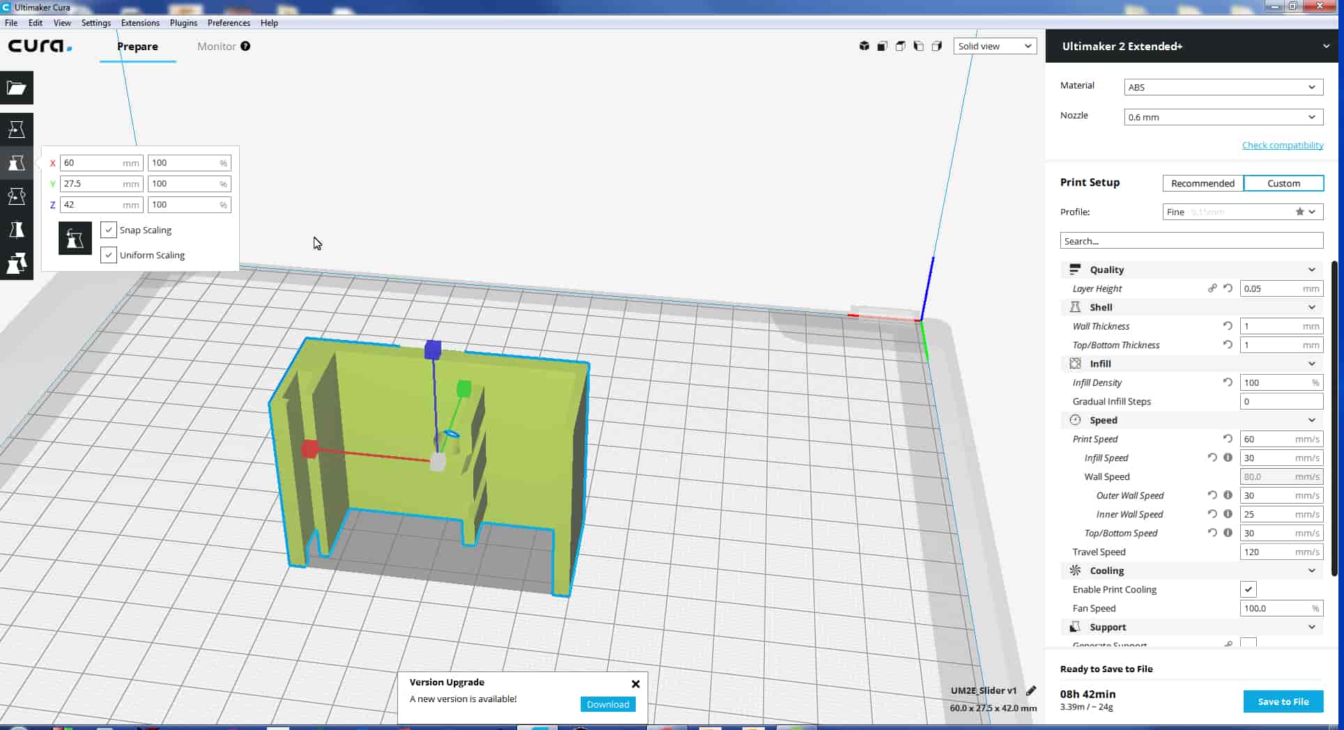 First, we export our 3D model in .stl file format an imported it in "Cura" softer which is support Ultimaker printers. We have adjusted the position of the model to apply for less support. We have used custom settings