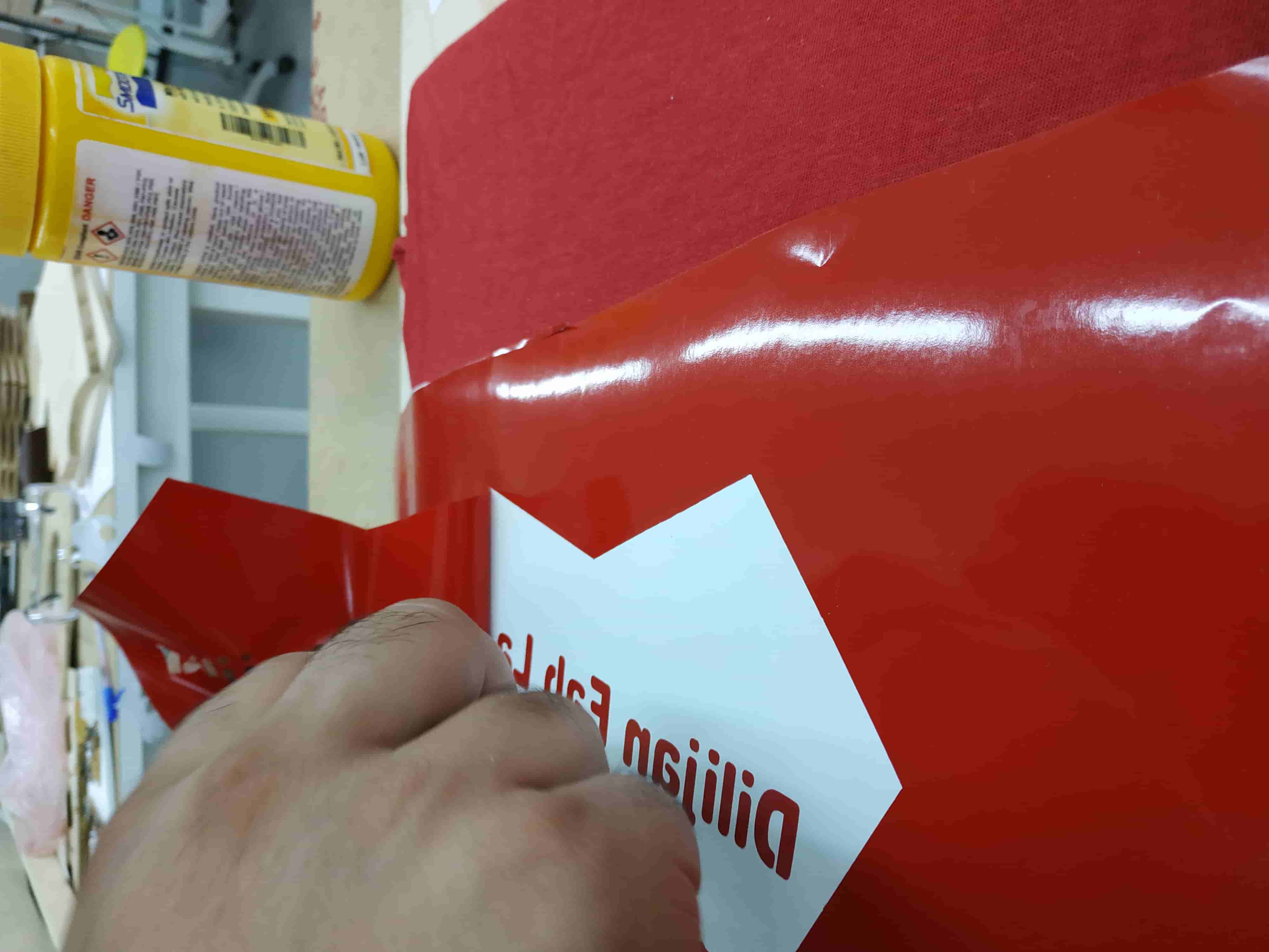 I seperated cut parts from paper and left only outline. Sticked scotch to the part with outline, after sepaerated red part from white paper and sticked it on the frame, then carefully removed the scoch. After I put a partof cardbord in the t-shirt for getting smooth surface.