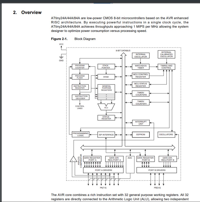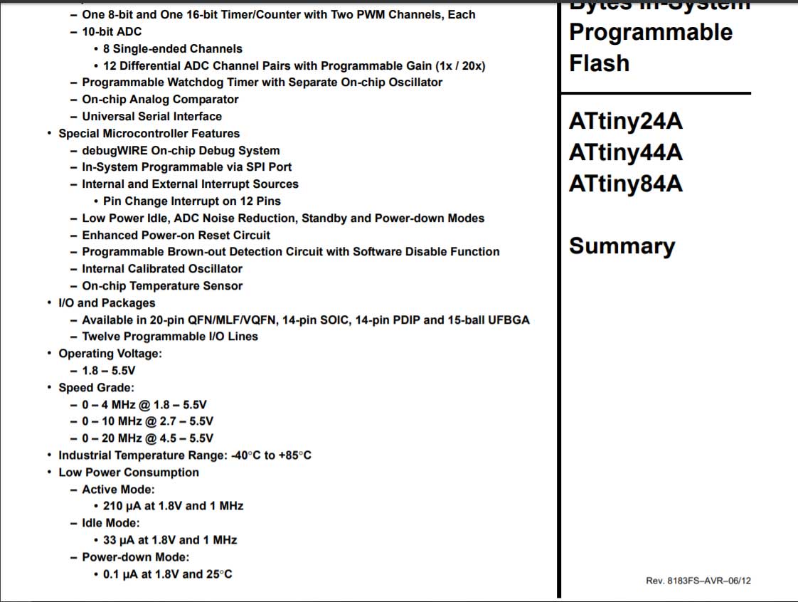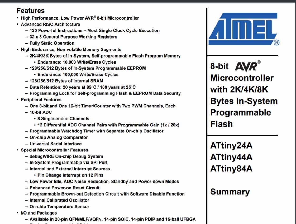 The first page of the datasheet is showing a wide variety of features that ATtiny44A has. High-Performance Low Power AVR 8-bit MIcrocontroller - it means that it has AVR architecture and 8-bit registers. 2K/4K/8K Bytes of In-system memory - It can be programmed 10000 times, and also it has 128/256/512 Bytes In-System EEPROM type memory - It can be programmed 100000 times. It has 8-bit 16-bit time counter, 10-bit ADC, Watchdog timer, Analog Comparator, Debug System, In-System Prog. via SPI port, On-chip temperature sensor. Voltage 1.8-5.5V .0-20 MHz (4.5-5.5V).