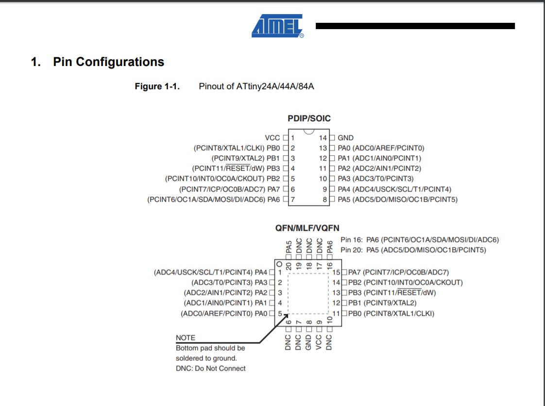 One of the most important things in the datasheet is Pin configuration. ATtiny44A has VCC(1) and GND(14) ports for power, PB0(2) and PB1(3) is for crystal (20.000 MHz), Reset pin PB3(4), programming pins PA4(9) SCL-clock, PA5(8) MISO, PA6(7) MOSI, other ports can be configured ass ADC, Input, output(I/0) and other .
