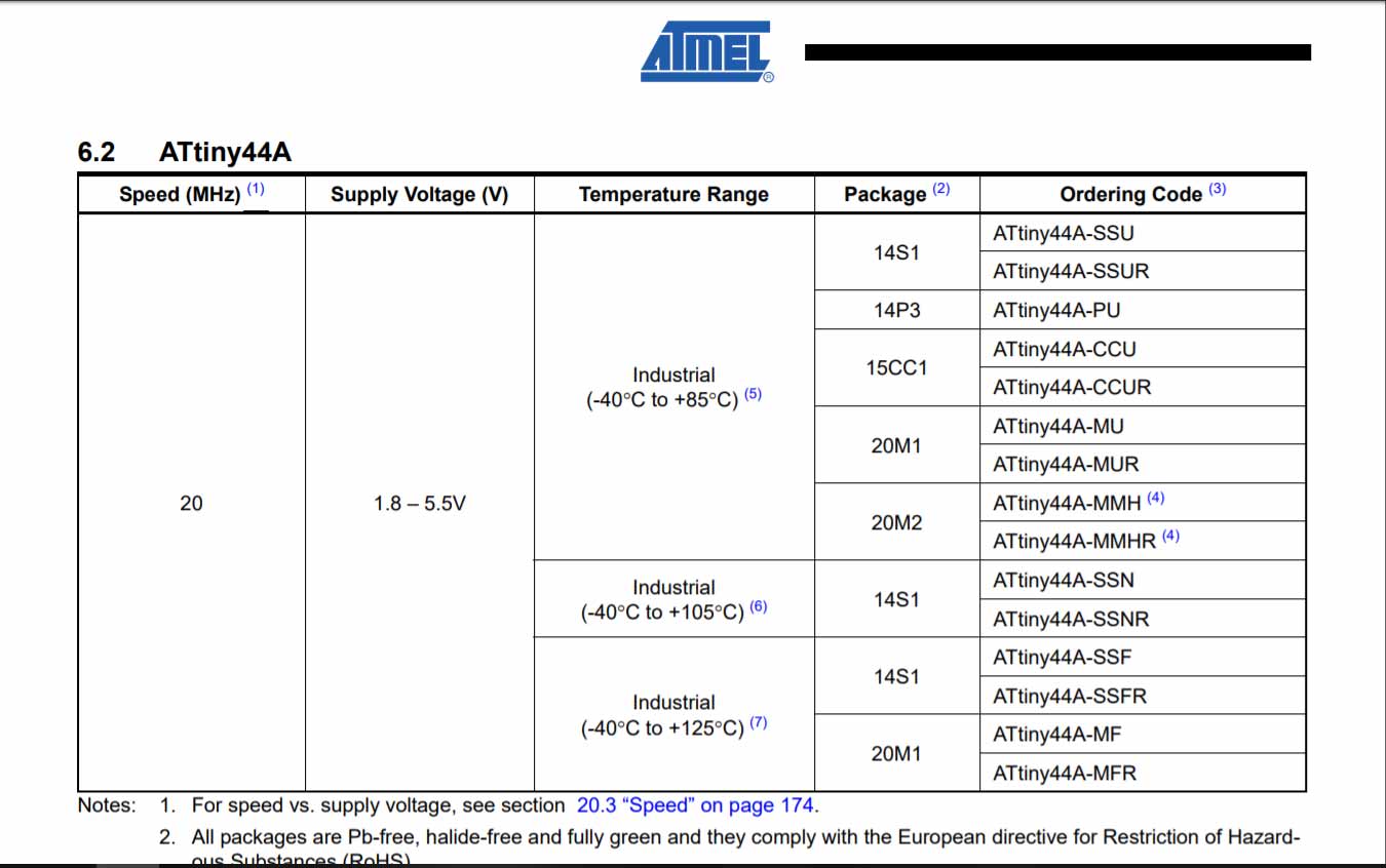Here you can see all versions of Attiny44A, Functionality is the same for all of them , the only differences are package and temperature range. Also the differences between ATtint24A, ATtint44A and ATtint84A is the size of memory.