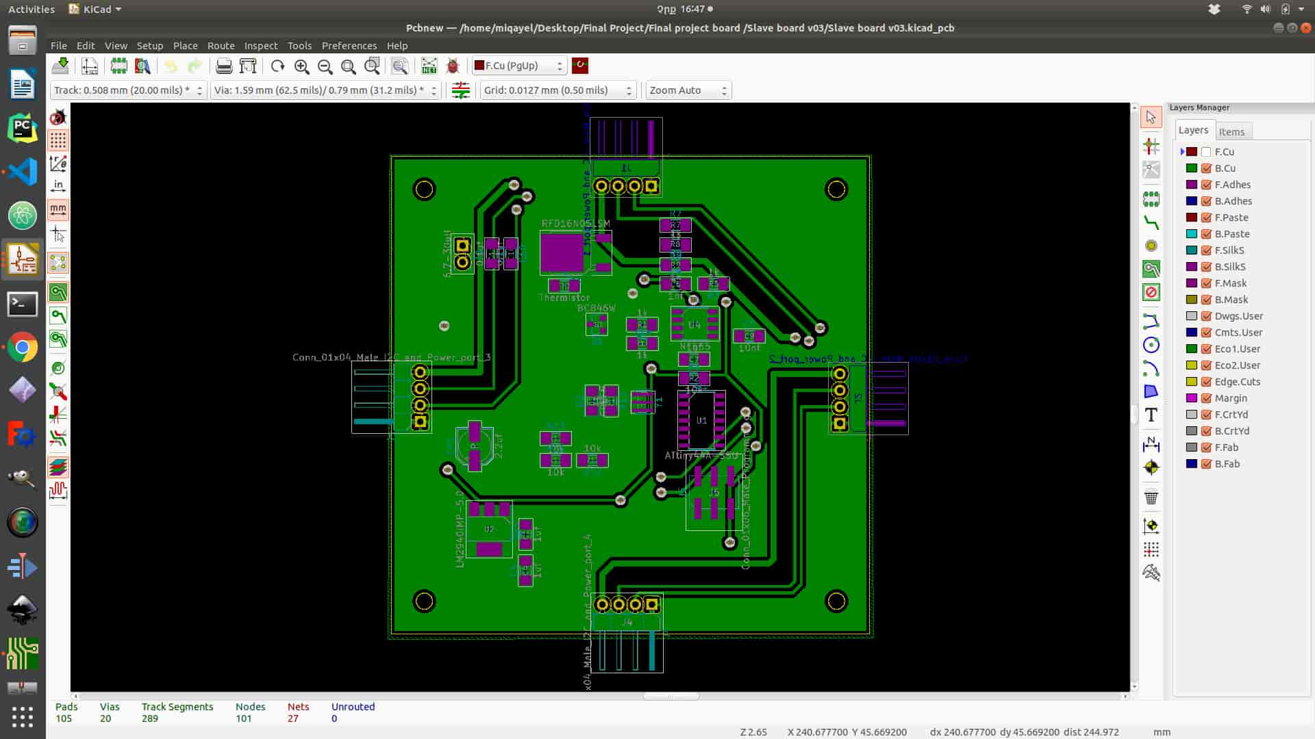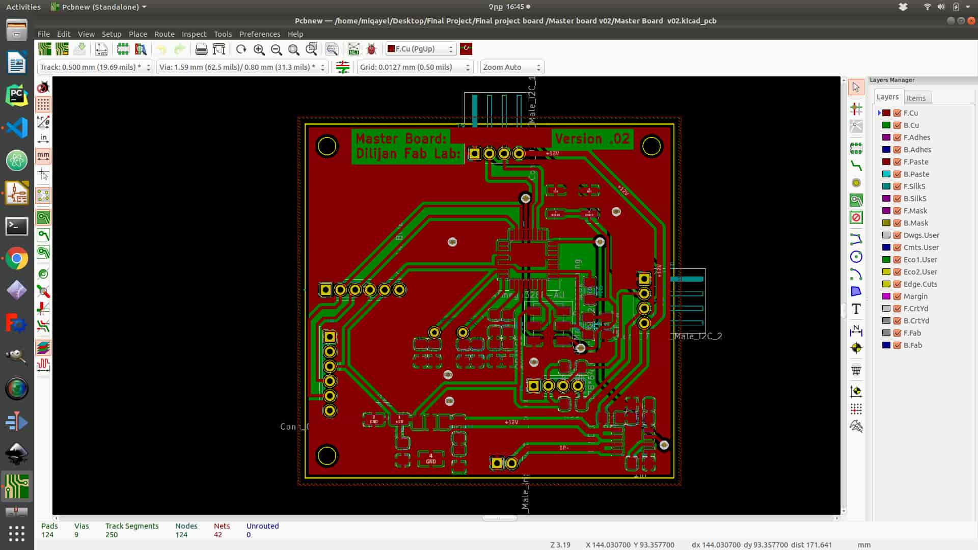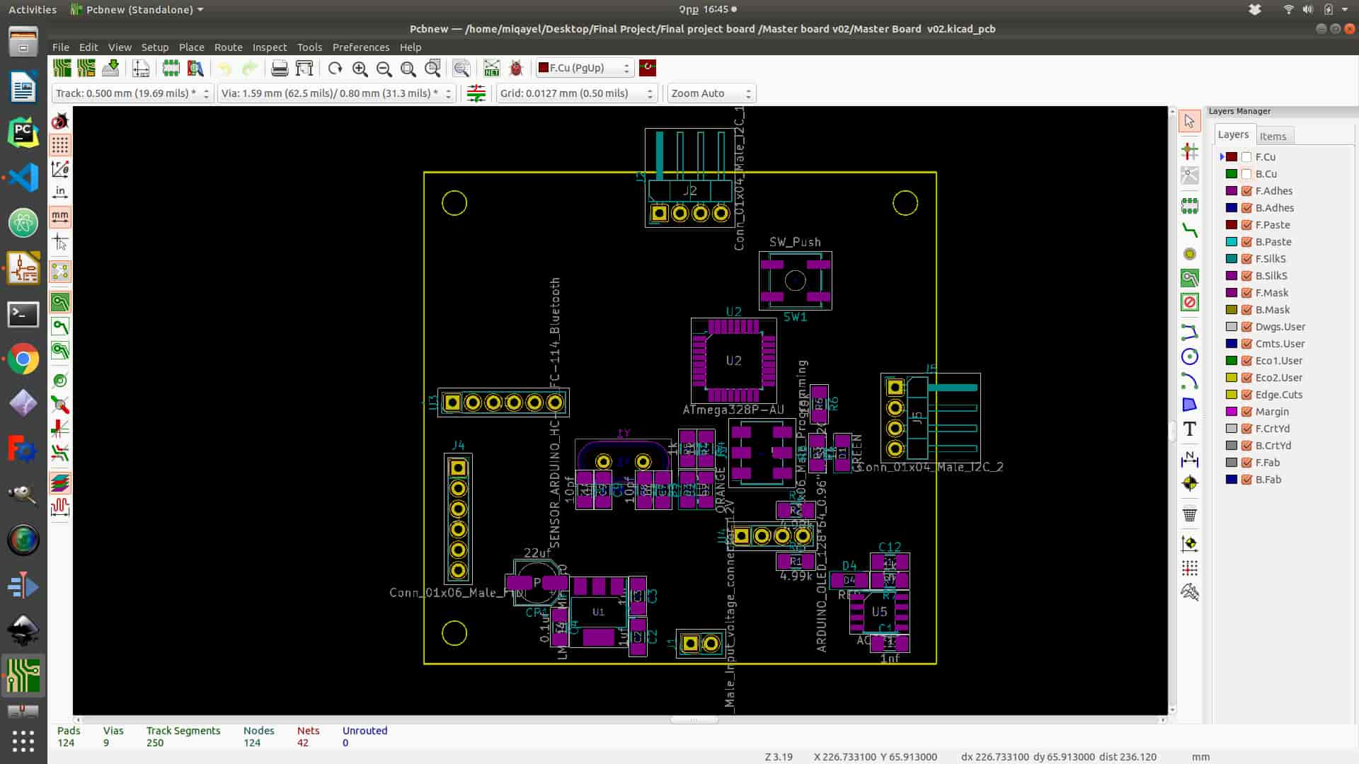 To start layout design you need to click to “Run Pcbnew to layout printed circuit board” icon on the top of the panel. After the program opens the next step is to read netlist that you have generated in schematics program. To add all footprint for all components, you need to click “Read Netlist” icon on the top of the panel and click “Read Current Netlist”, and you will get all footprints. From this point, PCB layout design is started. First, you need to organize all the components optimally. In my case, I tried to use only one layer of the board but I have got a problem with the ground connection. I have solved it by connecting several jumpers in the process of soldering (It is not represented on layout design). After organizing all components (you can do it as blocks like in schematics) next step is connecting them together by choosing “Route tracks” function icon on the right side of the panel. Also, you need to set tracks thickness and Grid to avoid mistakes. In the process of milling your board, you can adjust grid on the upper side of the panel(I have chouse 10.00 mils (0.2540mm) it is not the same diameter as my tool (1/64 inch ) by it is ok ). After setting up the “Grid” next step is connecting components together. Couple advises for connecting