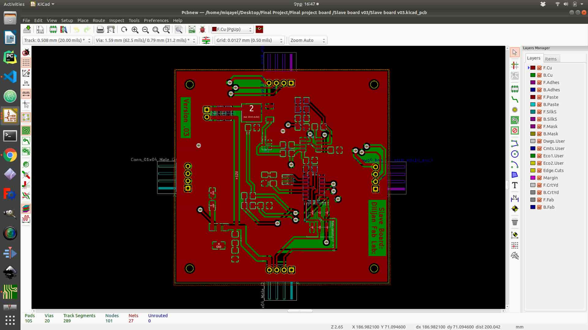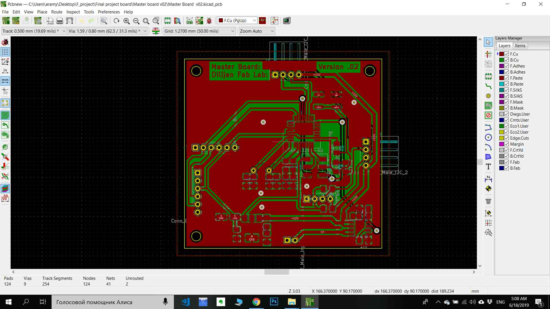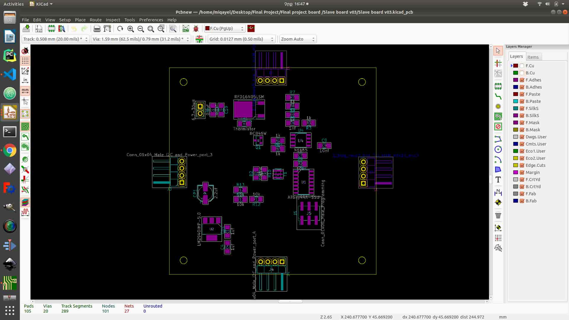 To start layout design you need to click to “Run Pcbnew to layout printed circuit board” icon on the top of the panel. After the program opens the next step is to read netlist that you have generated in schematics program. To add all footprint for all components, you need to click “Read Netlist” icon on the top of the panel and click “Read Current Netlist”, and you will get all footprints. From this point, PCB layout design is started. First, you need to organize all the components optimally. In my case, I tried to use only one layer of the board but I have got a problem with the ground connection. I have solved it by connecting several jumpers in the process of soldering (It is not represented on layout design). After organizing all components (you can do it as blocks like in schematics) next step is connecting them together by choosing “Route tracks” function icon on the right side of the panel. Also, you need to set tracks thickness and Grid to avoid mistakes. In the process of milling your board, you can adjust grid on the upper side of the panel(I have chouse 10.00 mils (0.2540mm) it is not the same diameter as my tool (1/64 inch ) by it is ok ). After setting up the “Grid” next step is connecting components together. Couple advises for connecting
