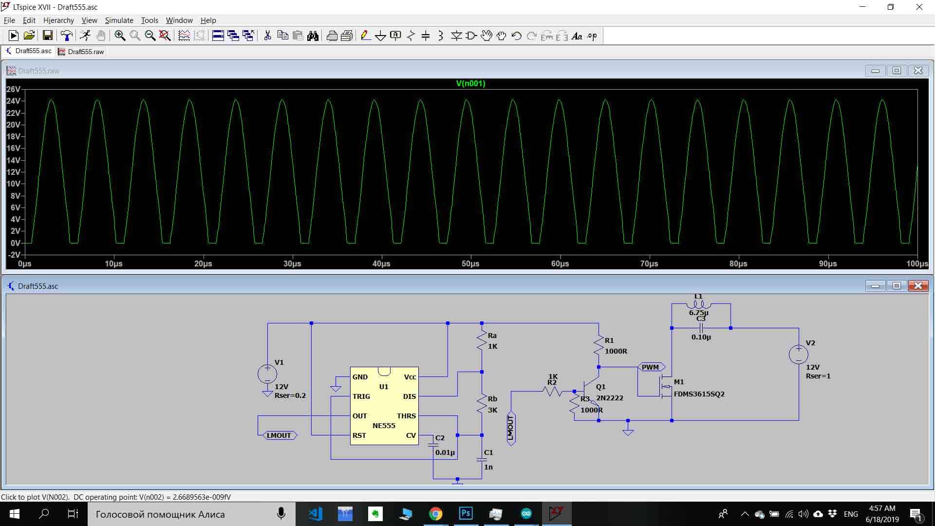 As I say in the introduction as a base of my charging board I use 555 timers also for I2C communication with a master board I used ATtiny44A-SSU microcontroller, this microcontroller is receiving temperature data from a thermistor which is nearby MOSFET transistor and send it to master board. Wireless charging Board design starts with simulations on LtSpice. I was able to simulate about 162Khz frequency (which is standard for qi charging ). After simulations, I drow schematics, understand which components I need, after getting all components I started layout design(for designing my board I used KICad software).