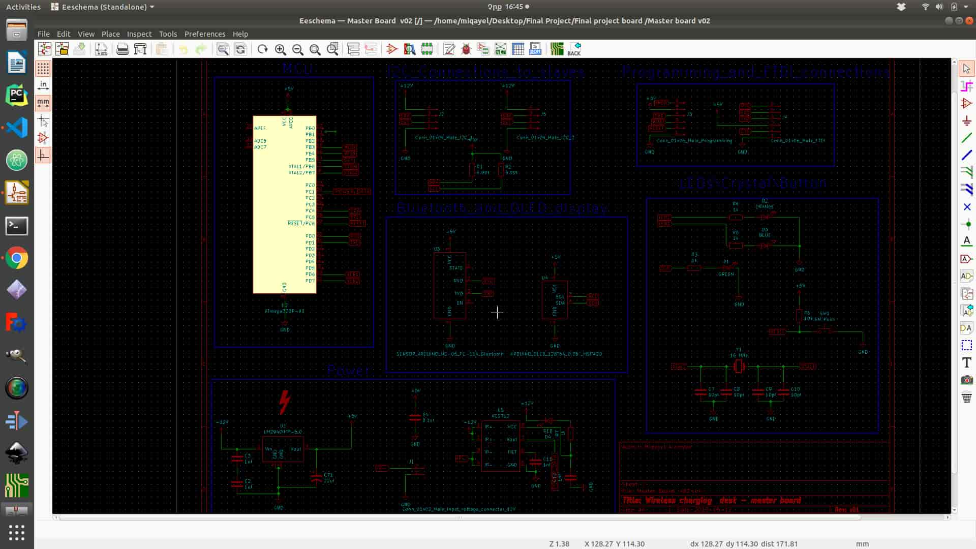 The electronics part of my project is the most important part. I decided to make wireless charging desk which has 8 charging coil on it and on master board for communication. As a base of my charging coil, I decided to peck 555 timer IC (but only at the end I realize that I can use ATtint44a as well). Desk works as a network of coils which are connected to each other by power and data ports. Master board receives data from the board and send it via Bluetooth