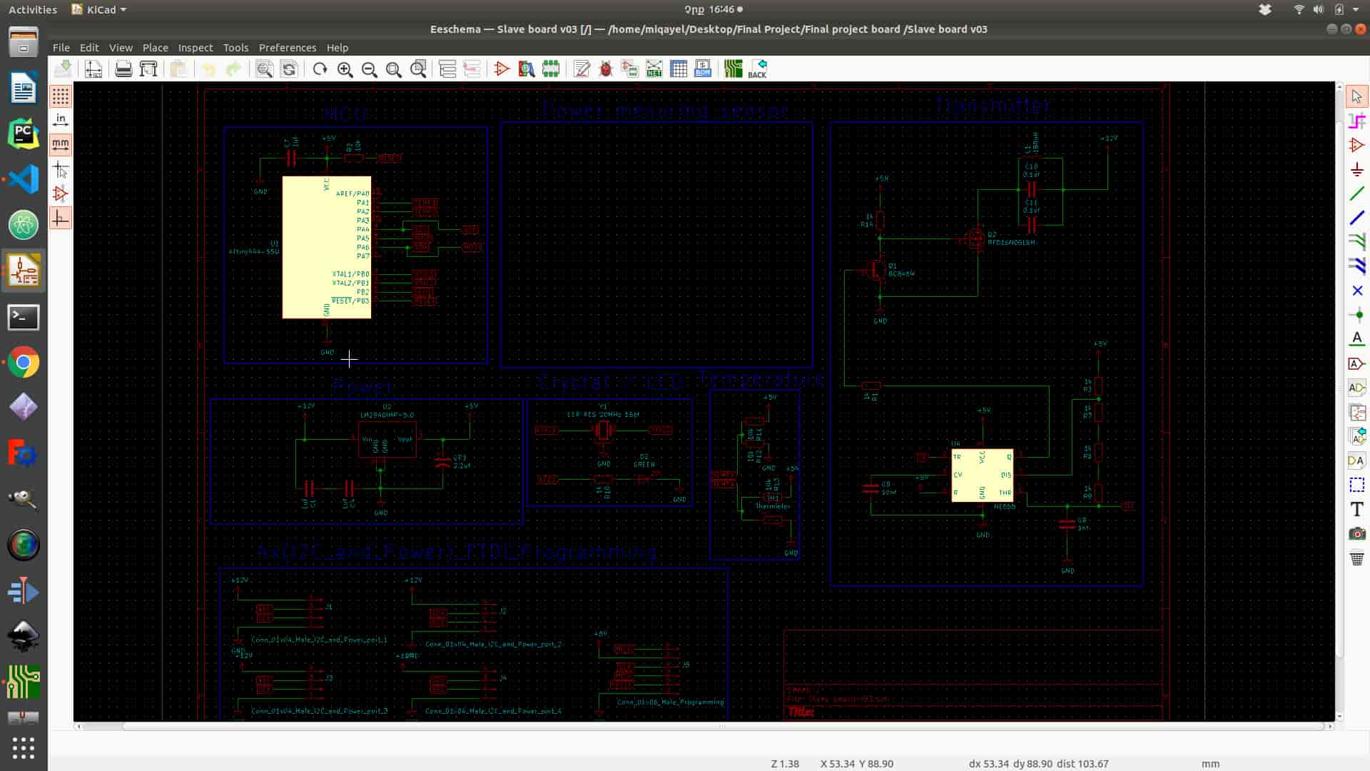 For master board I used ATmega328P-Au microcontroller which is collecting temperature data vai I2C protocol, Also It’s reades power consption from power (AC712)mesuring sensor via ADC, which is connected to power input 12V. Also microcotroller send data using HC-05 Bluetooth modul .