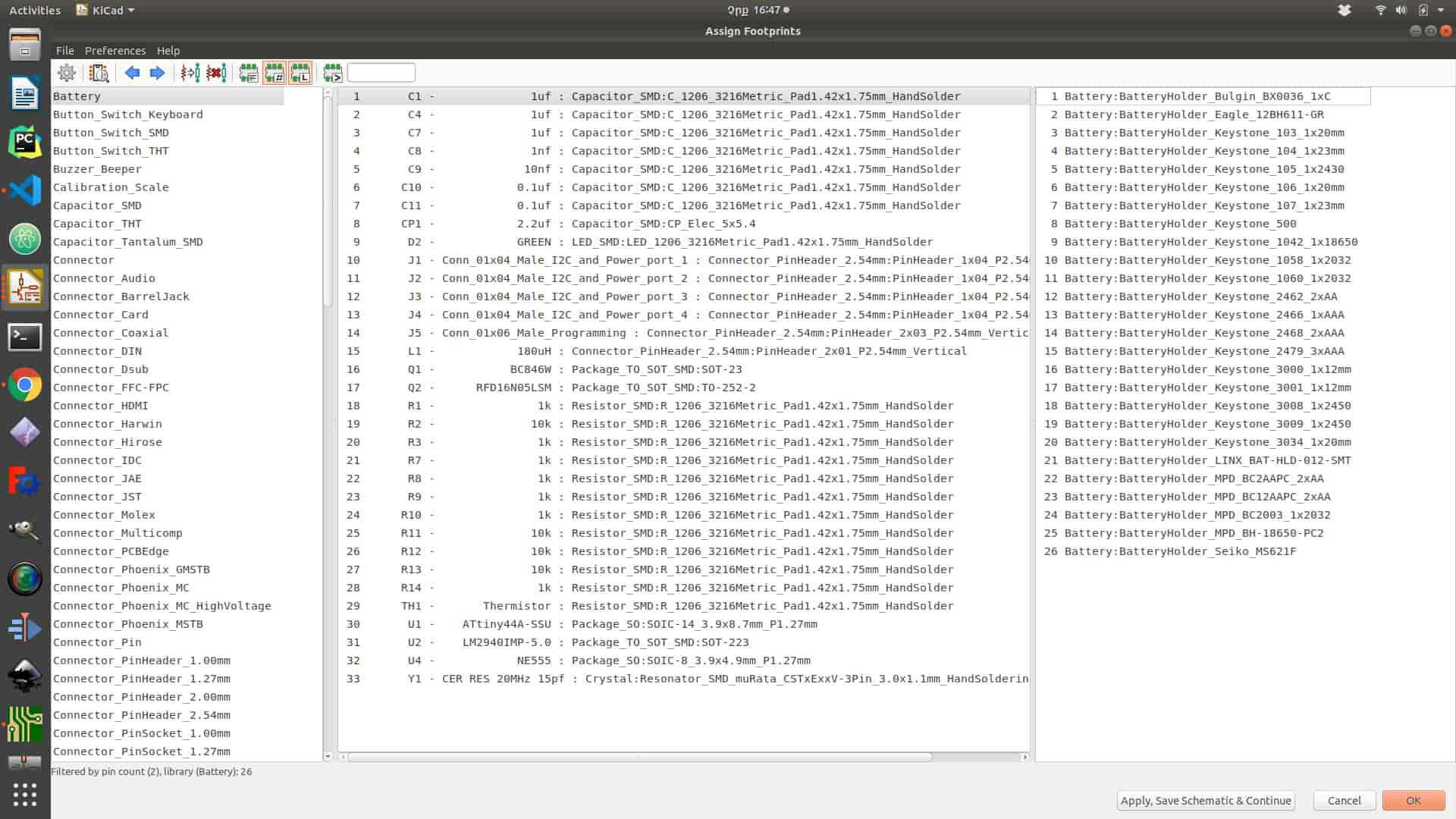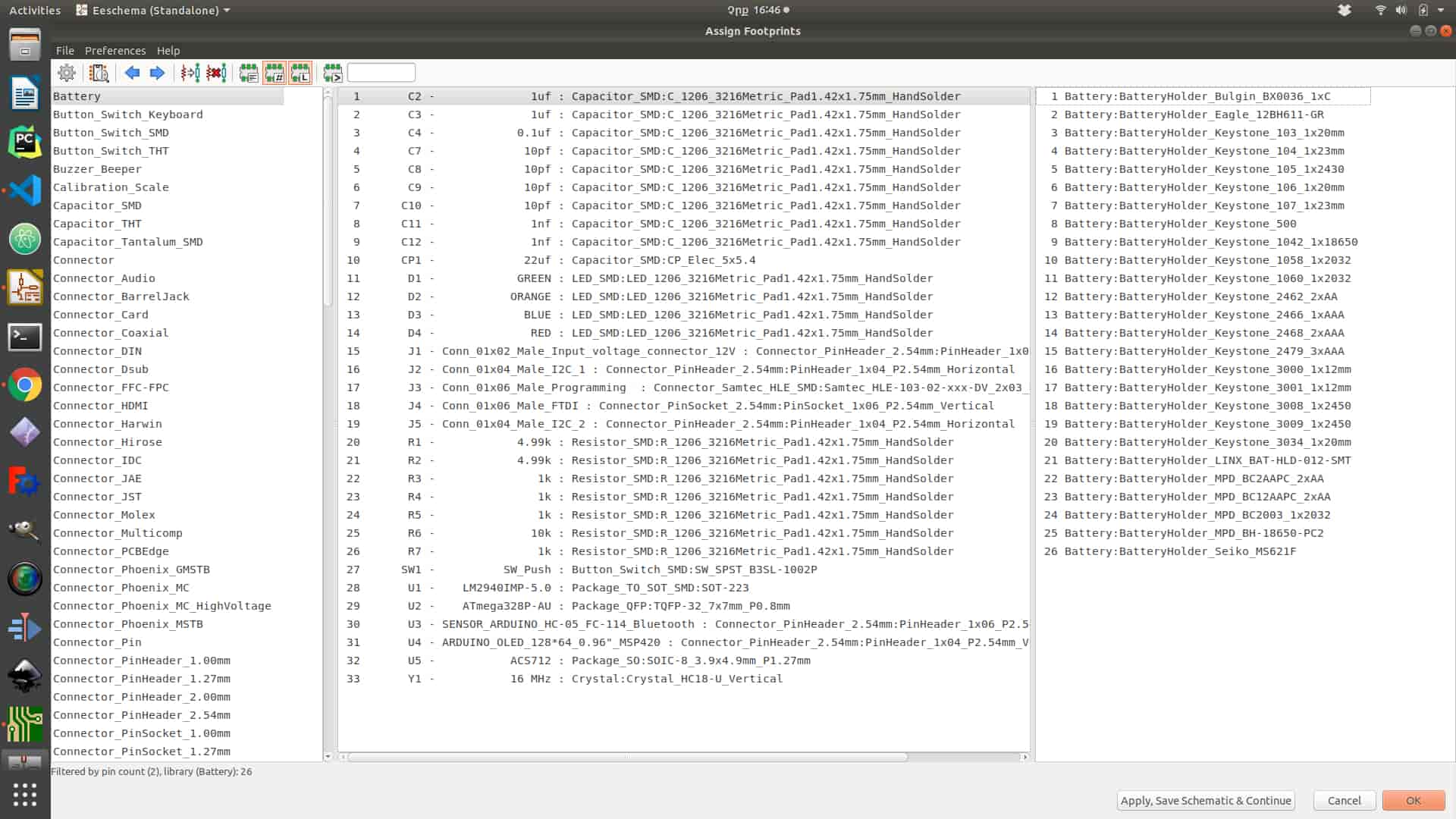 After checking all symbols, values, numbers, and connection between parts you can assign footprints for each part (choosing package) by going to “Tools > Assing Footprints”, after choosing a package for each component press “Apply, Save Schematics and Continue”.After click “Generate netlist” by clicking the icon on the top of the panel and finally you have done with schematics. You can go and start work on PCB layout if any problem appears you can go back to change and generate netlist again. If you what to know more how to draw schematics and reading datasheet go to week 7 “Electronics Design”.