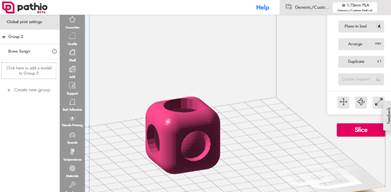 product in Thinkercad environment, one view in Pathio and the final product while printing and in its