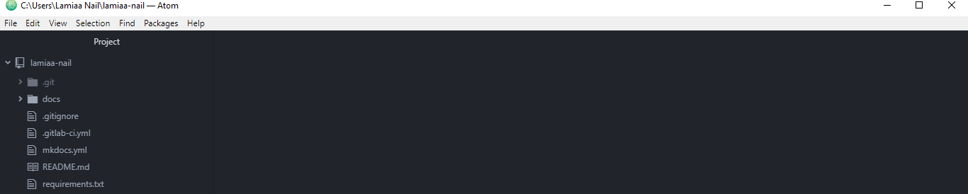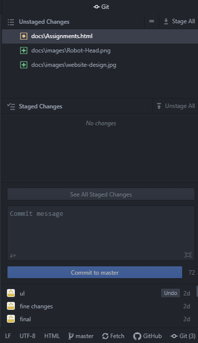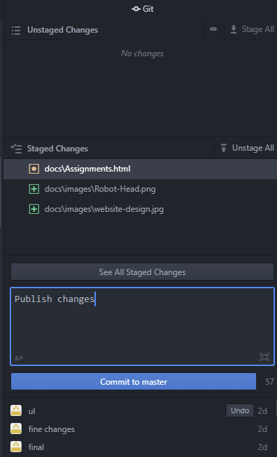 To publish my website or reflect any changes I do locally, I first had to delete the Mkdocs template files from the docs folder. Then I moved my website files to the docs folder. All the edits that I did appear in Atom as unstaged changes.