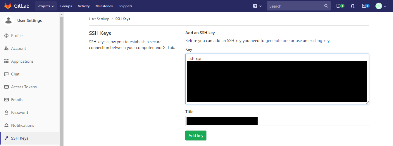 in the upper right corner>> settings>>>SSH keys, and pasted the key in the box>>click add key