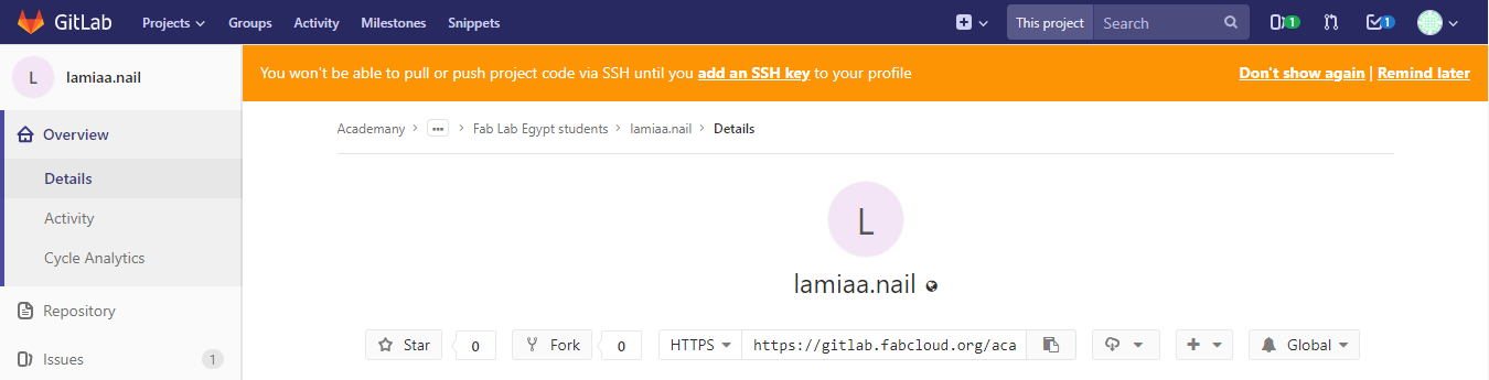 Then, I needed to clone my git repo locally. I copied the SSH url in my repository.