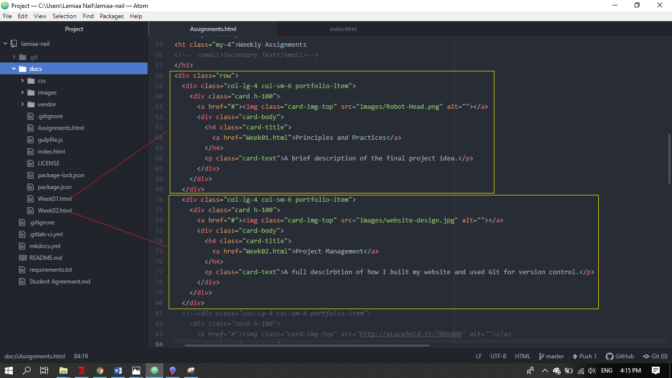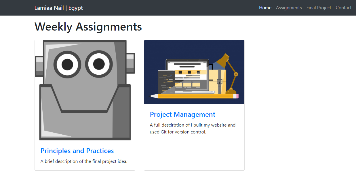 Then, I edited the assignments page code to contain only two cards corresponding to the first two weeks., containing an image and a brief description of the week’s assignment.