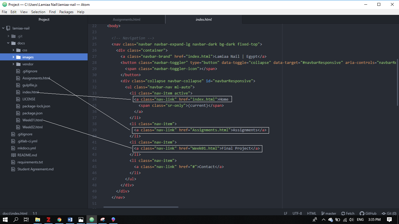 I copied the navigation bar codes to the newly created index page, changed the page titles in the navigation bar and linked them to the newly created pages.