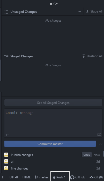 So, I click stage all and write a commit message, which is a description of the changes that I did to the current version of the website. Finally click commit to master.