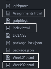 The current home page (index.html) contains the 3 columns layout, so I renamed it to Assignments.html, and created a new index.html where I will write down my bio. I also created two html pages for first and second week’s assignments.