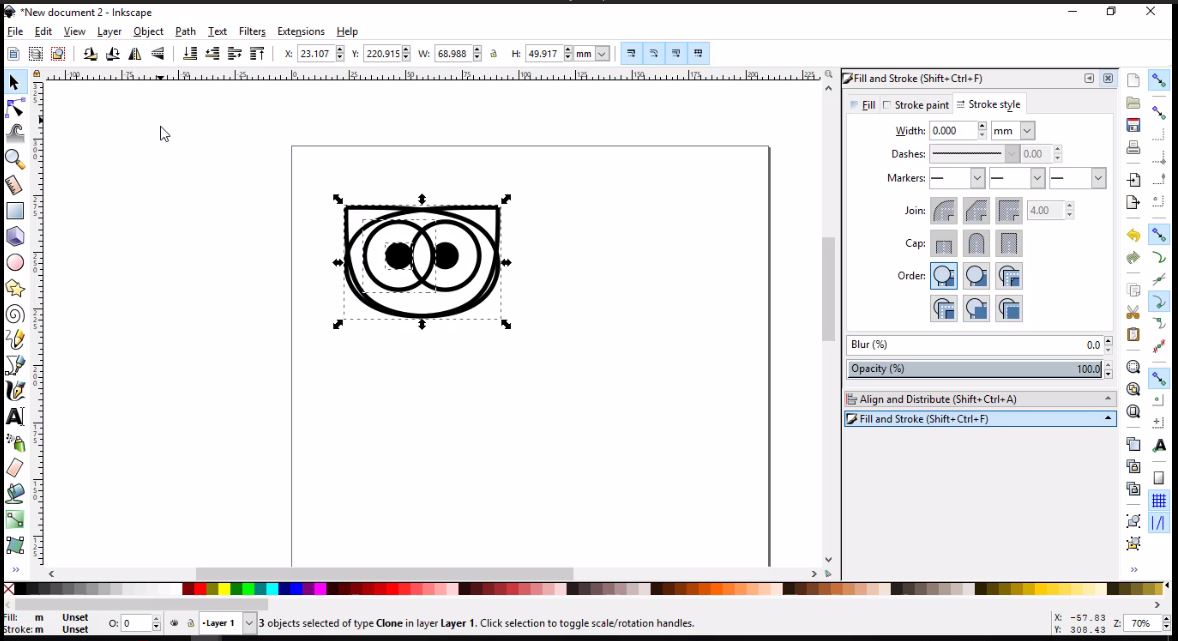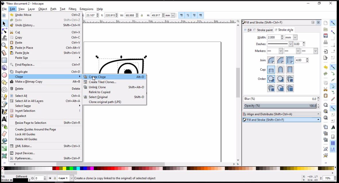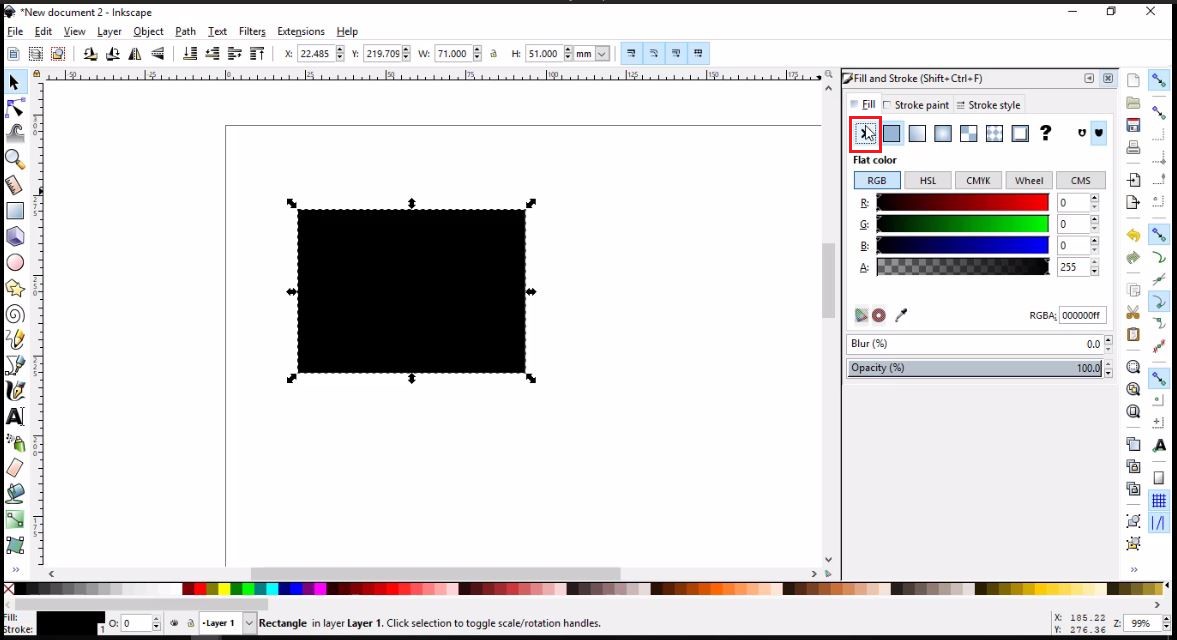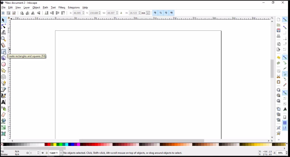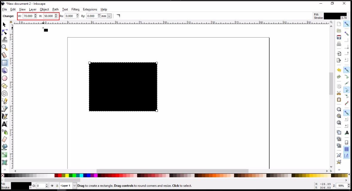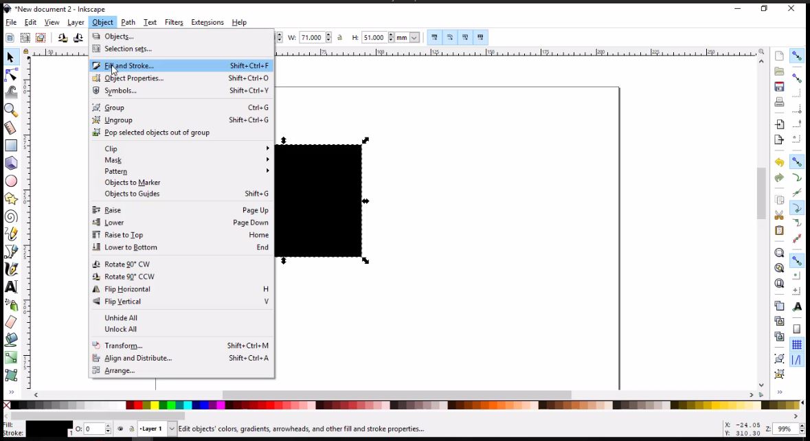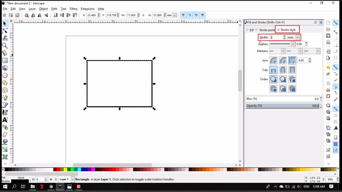 - To change the rectangle from filled to border lined, I clicked on Objects in the tool bar, then Fill and Stroke. I finally changed the width of the border to 2 mm
