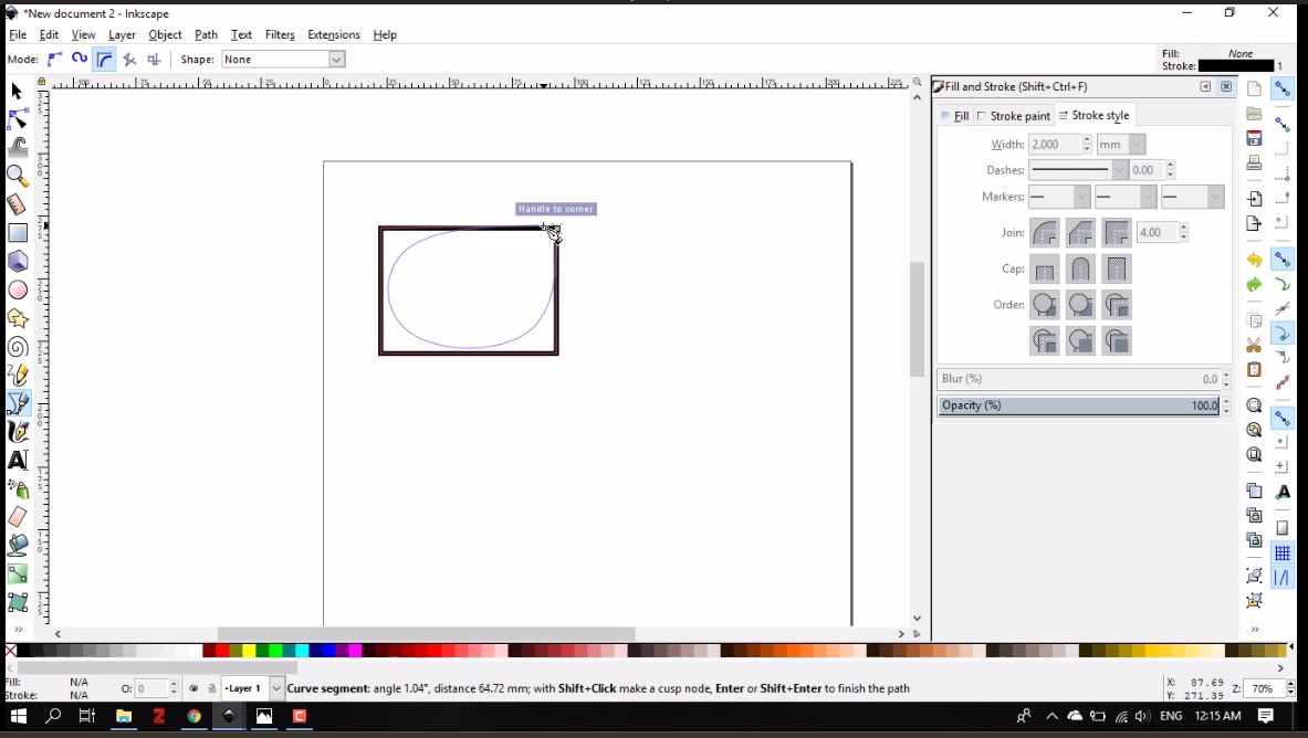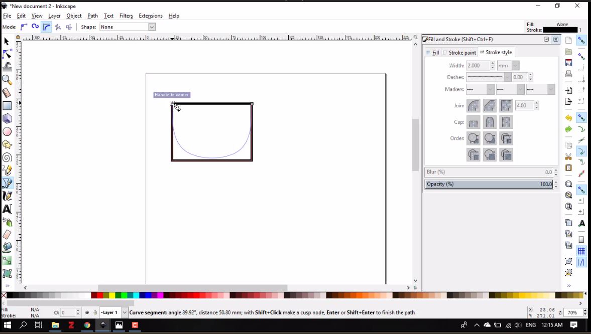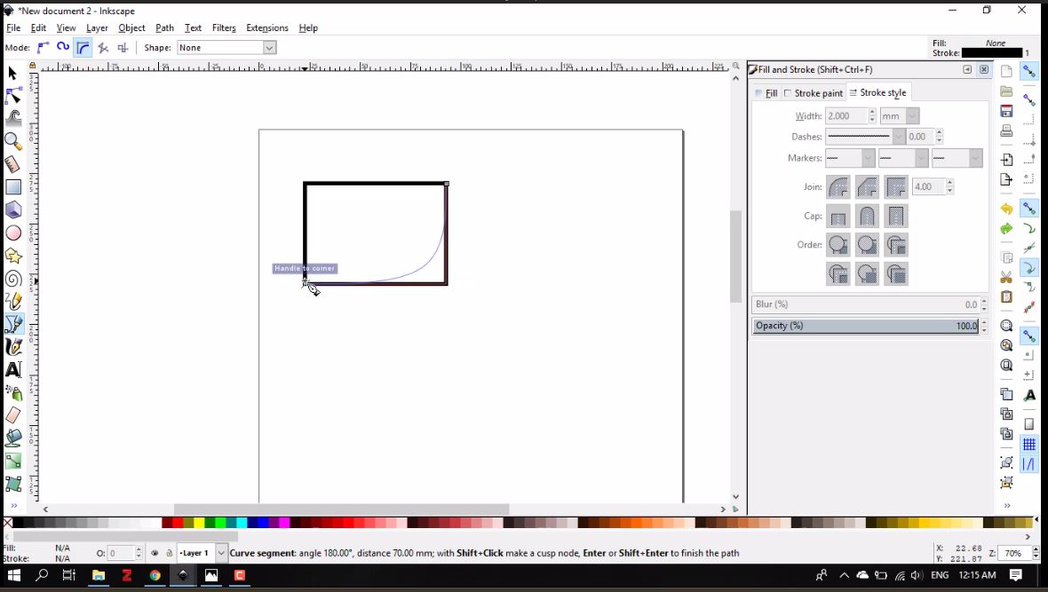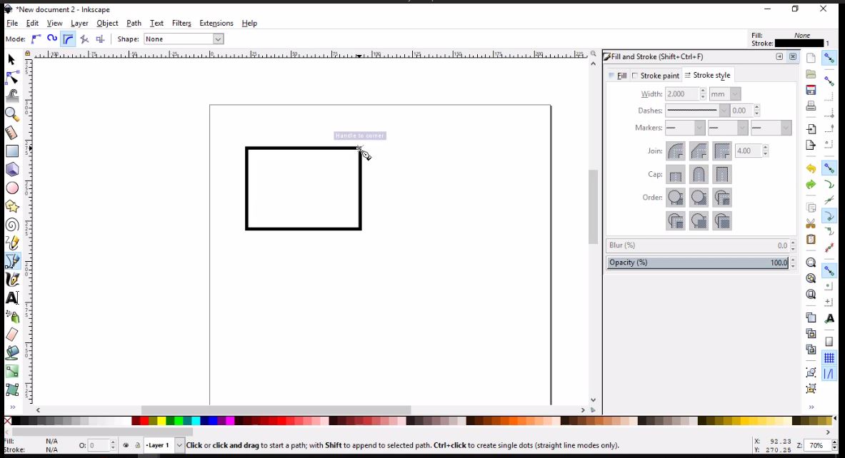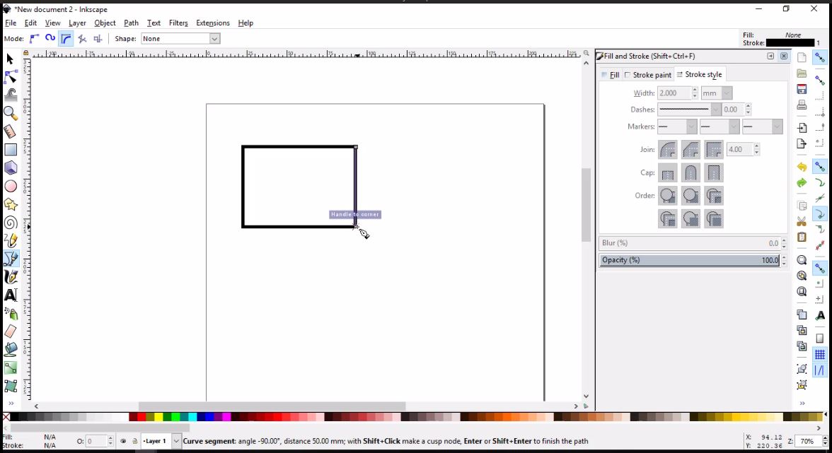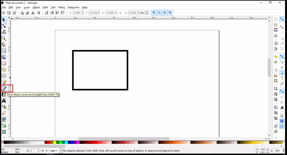 - From the tool bar on the left, I clicked Draw Bezier curves icon. I placed the tool tip on the upper right corner and clicked to place the first node, then moved to do the same with the lower right, lower left, upper left, and back to the upper right corners, respectively.