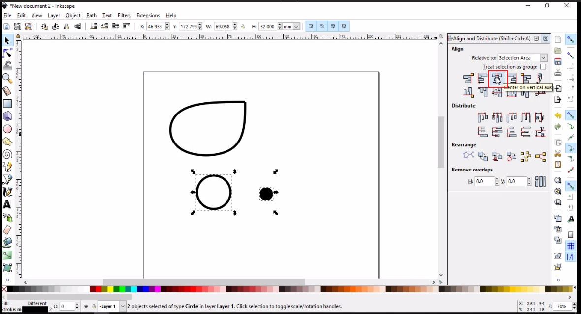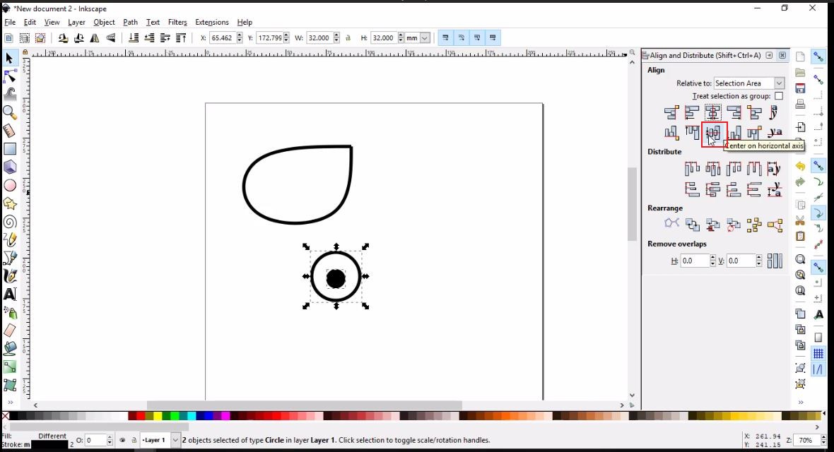 - I now need to align the iris exactly in the center of the eye ball. To achieve this: click Objects>>>Align and Distribute, then select the circles that I need to align. From the box that appeared on the left click Center on vertical axis, then on Center on horizontal axis, as shown below.