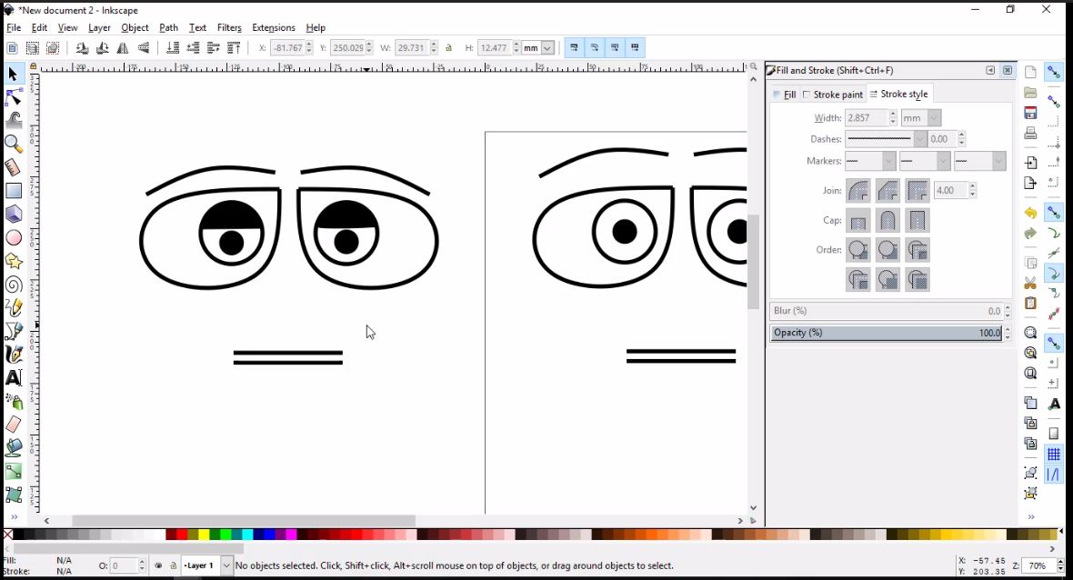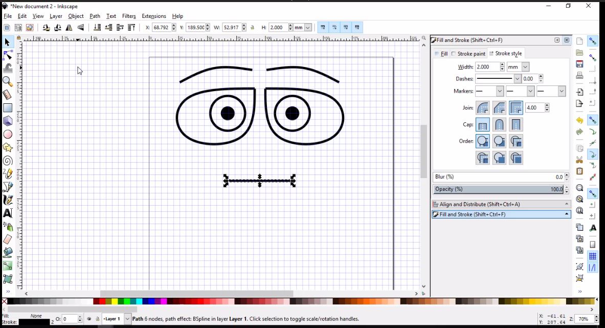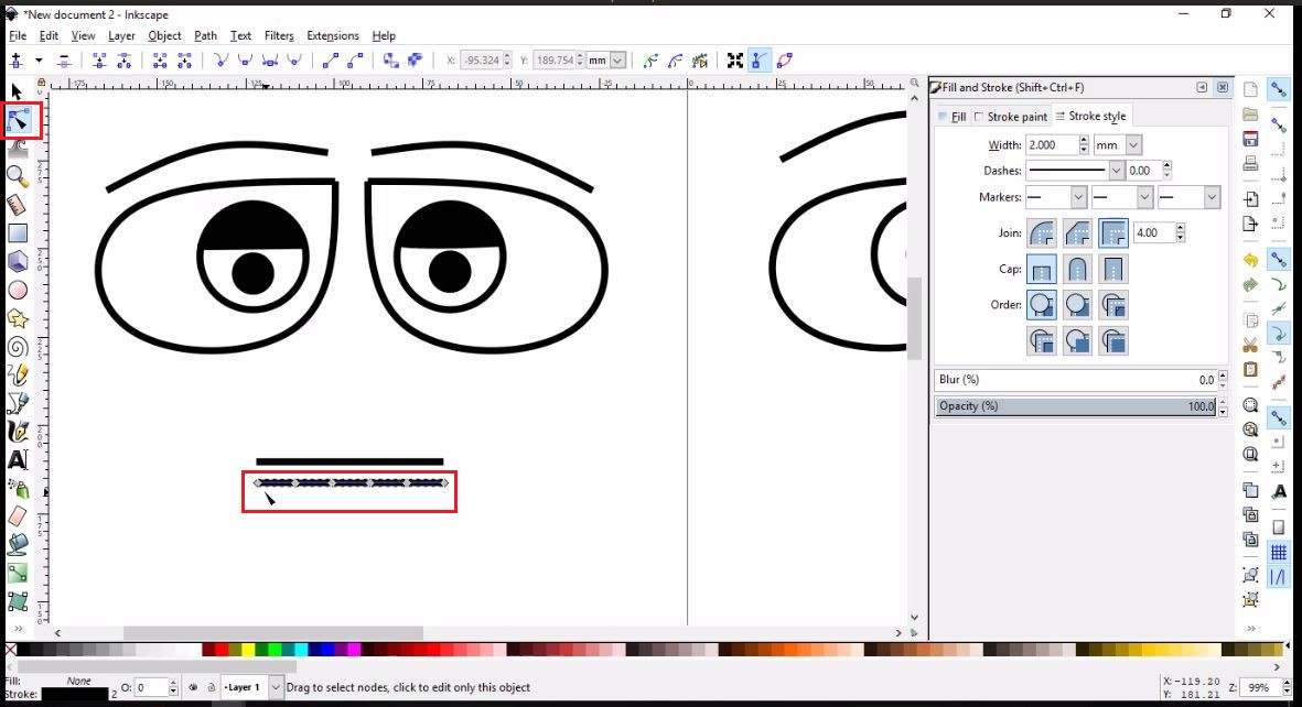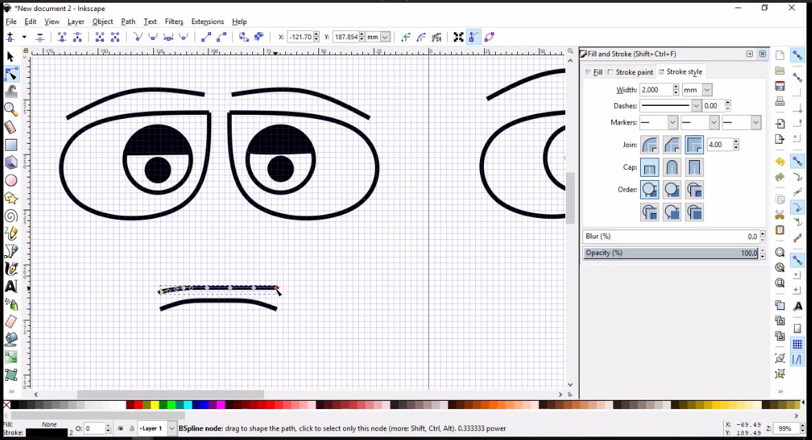 - Then, I will simply use the Draw Bezier curves tool to draw the left brow using three nodes, then I will clone, flip and place it as I did with the eye.