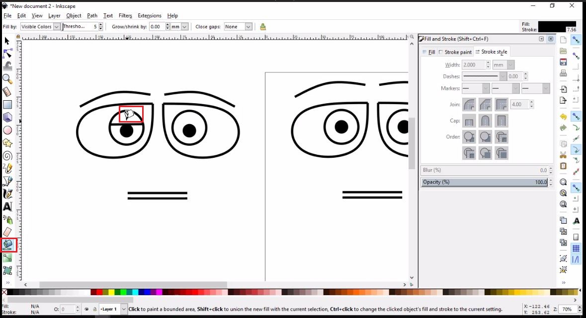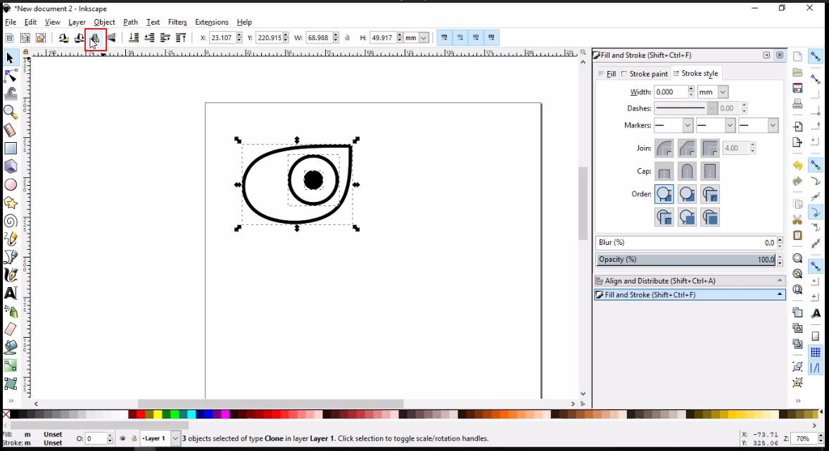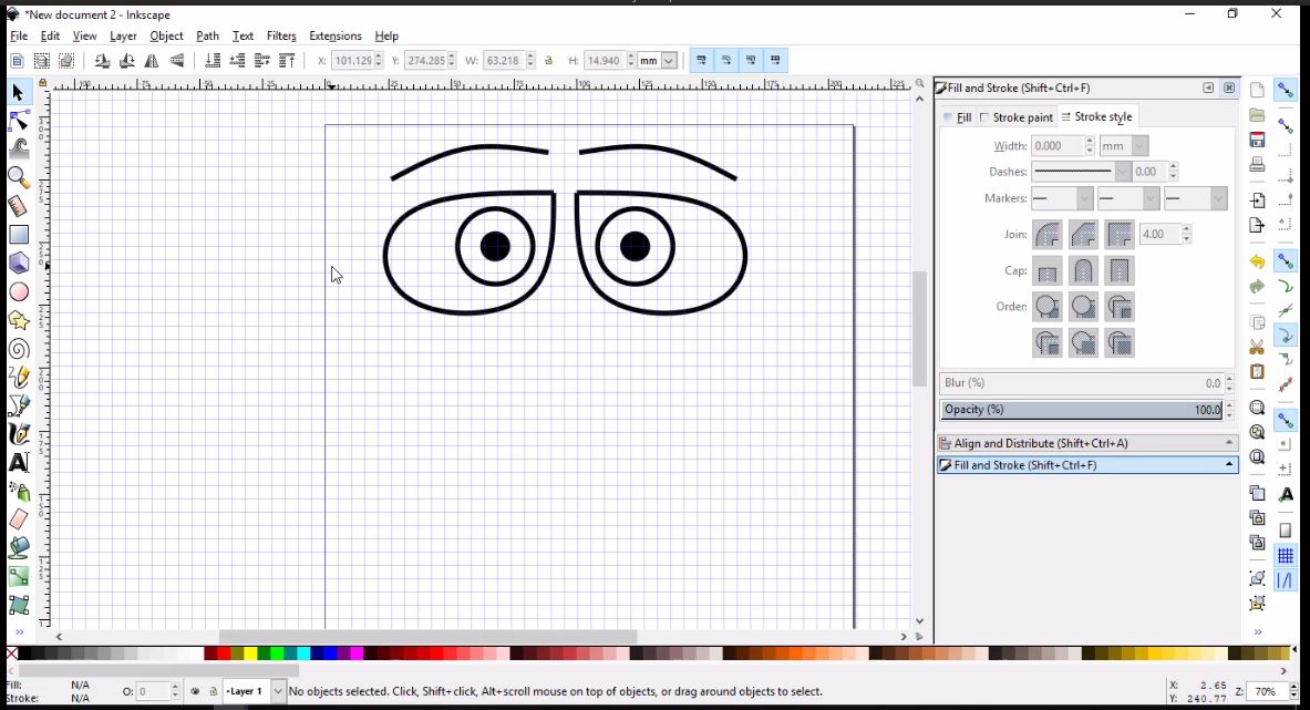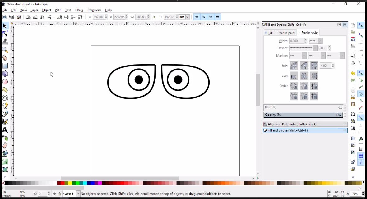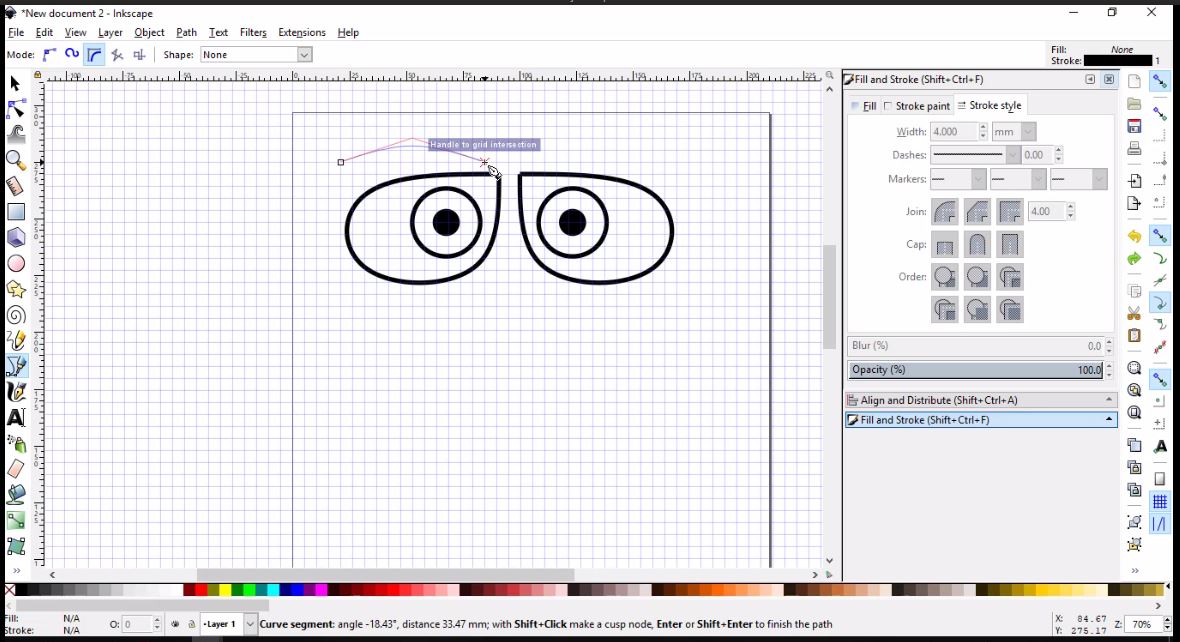 - Then, I will simply use the Draw Bezier curves tool to draw the left brow using three nodes, then I will clone, flip and place it as I did with the eye.