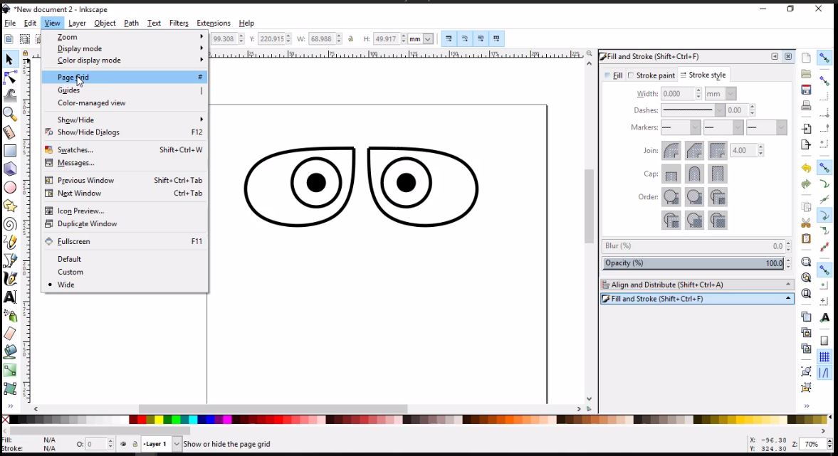 - I will move on to draw the eye brows, but first I need some guidance on where to place the brow, so I made use of the page grid view in Inkscape for this purpose.