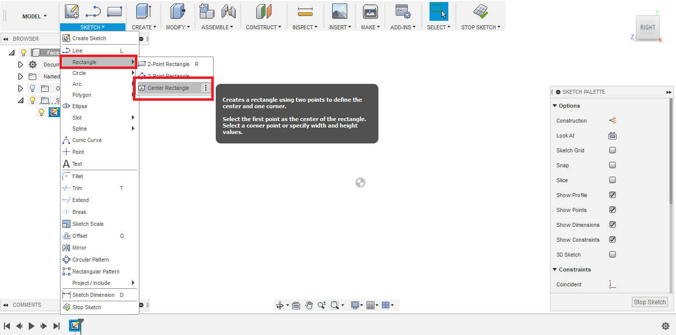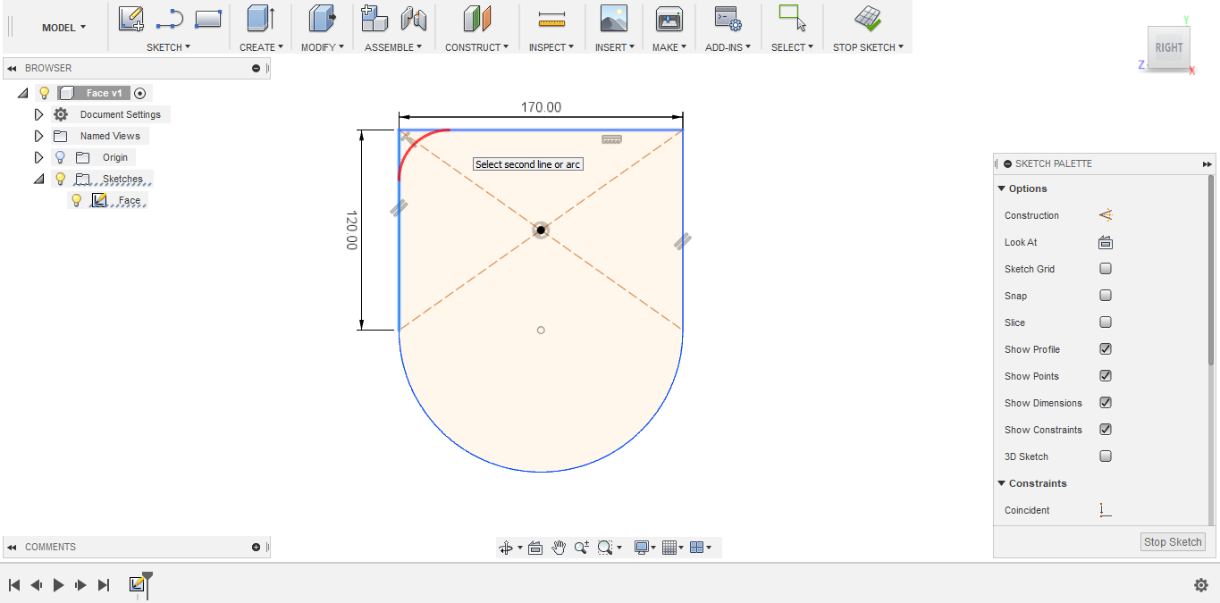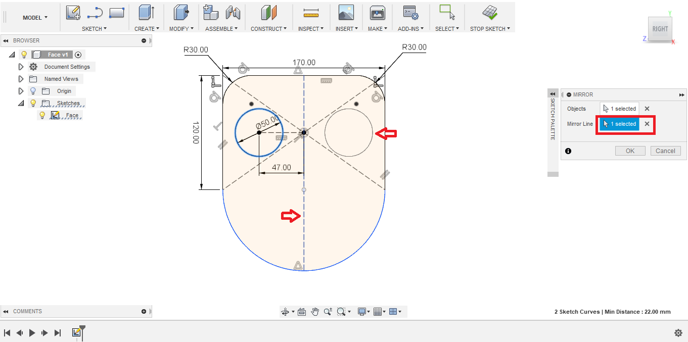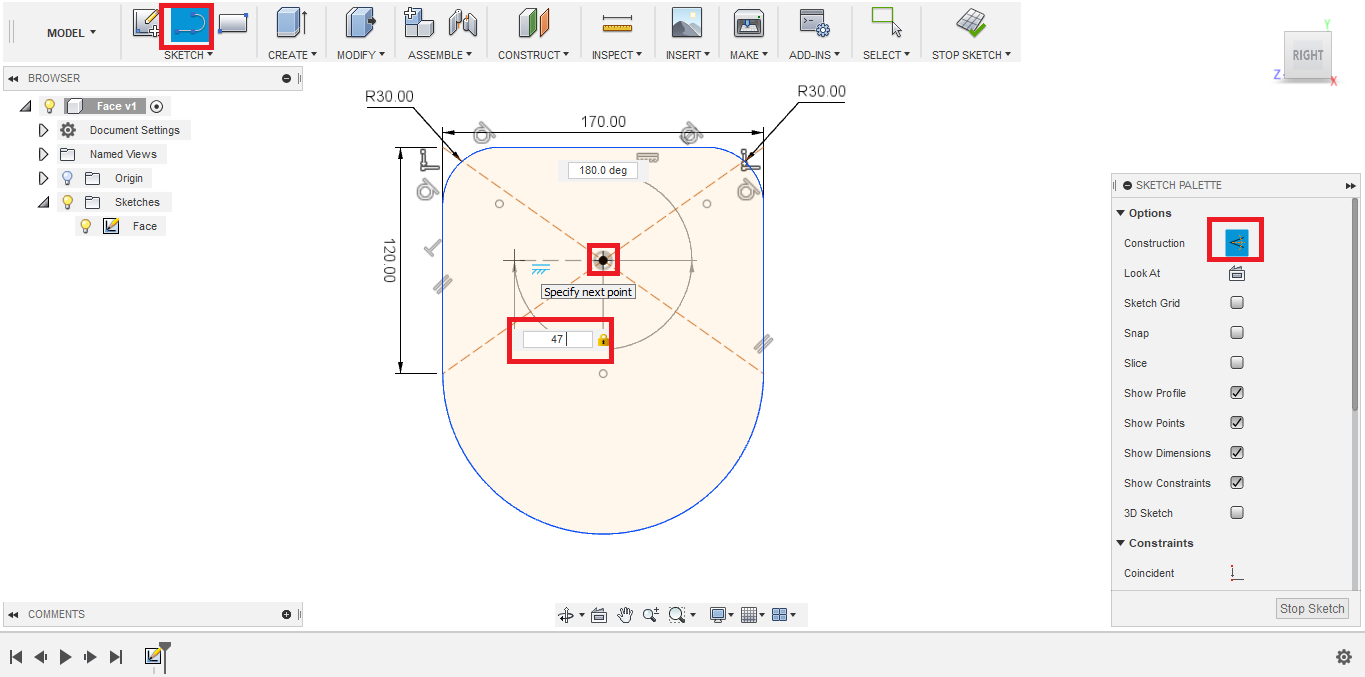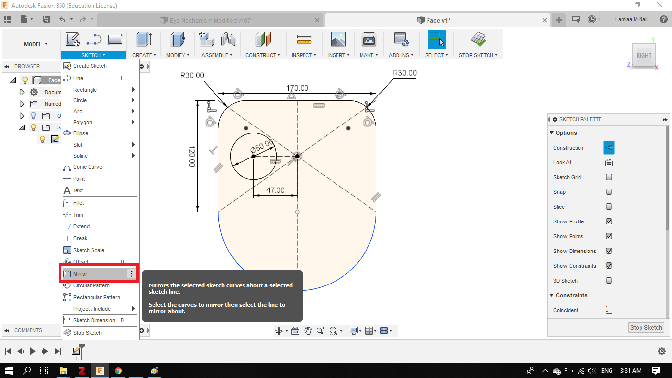 - To sketch the left eye, I decided to use the Mirror tool. But first I needed to create a mirror line. I created another construction line the divide the face into two equal halves.