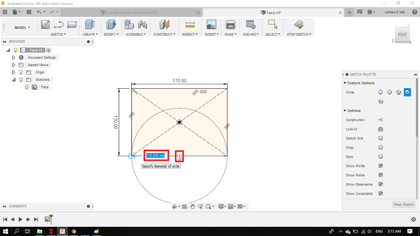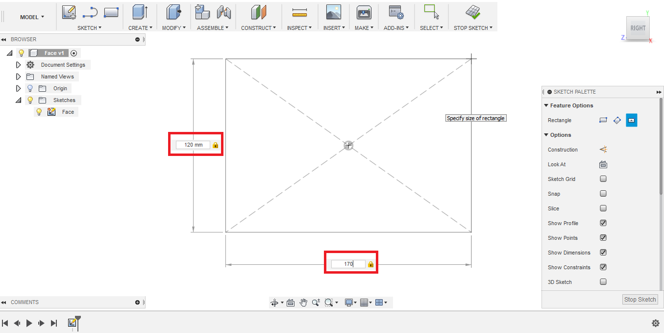 - To sketch the upper half of the face, forehead and eyes area, I created a rectangle: with 170 mm length and 120 mm width