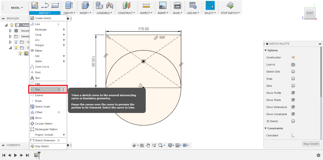- Now, I needed to remove the upper half of the circle, leaving only the lower half, I used the Trim tool.