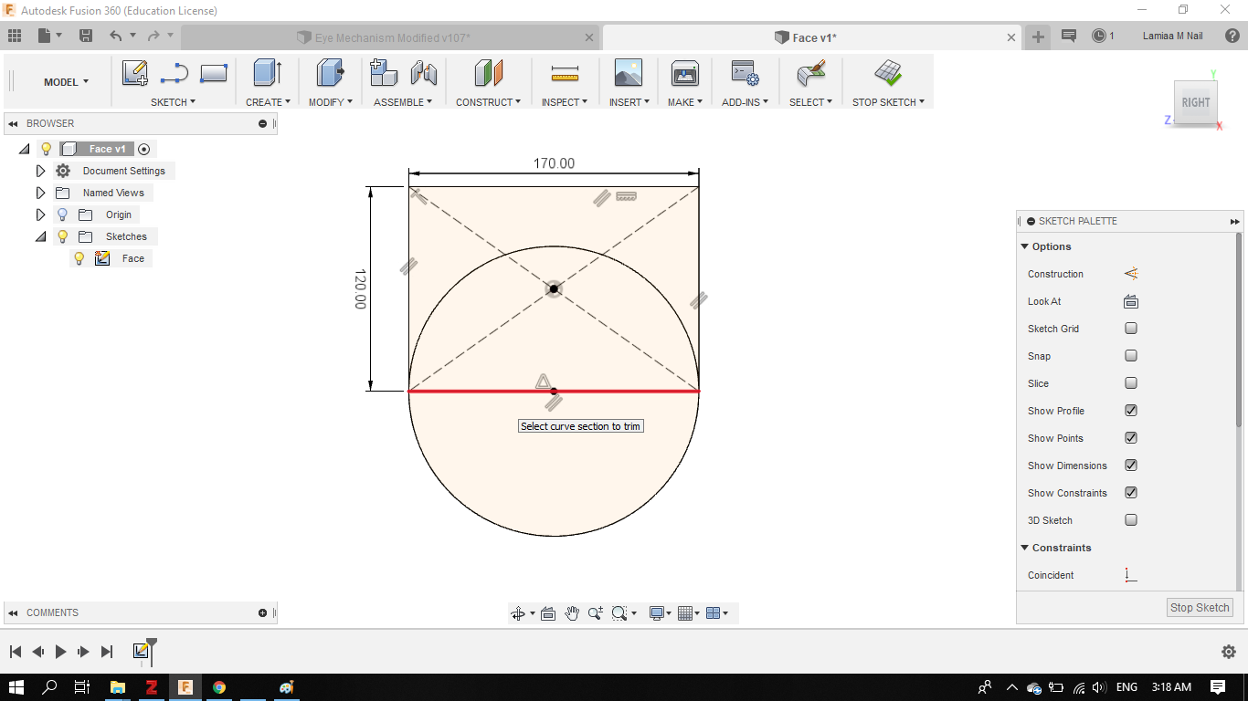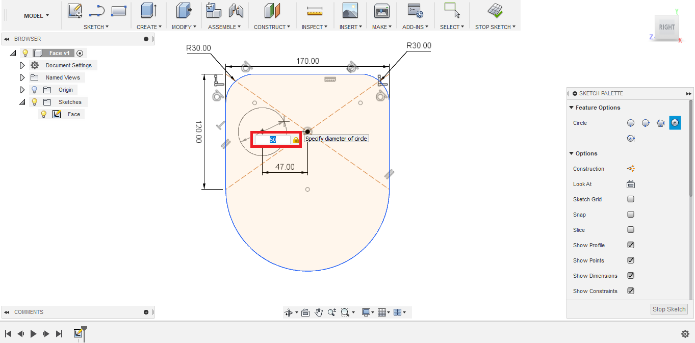 - To sketch the lower half where the mouth and chin are located, I created a circle, with 85 mm radius.