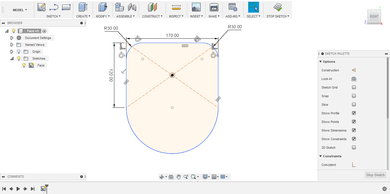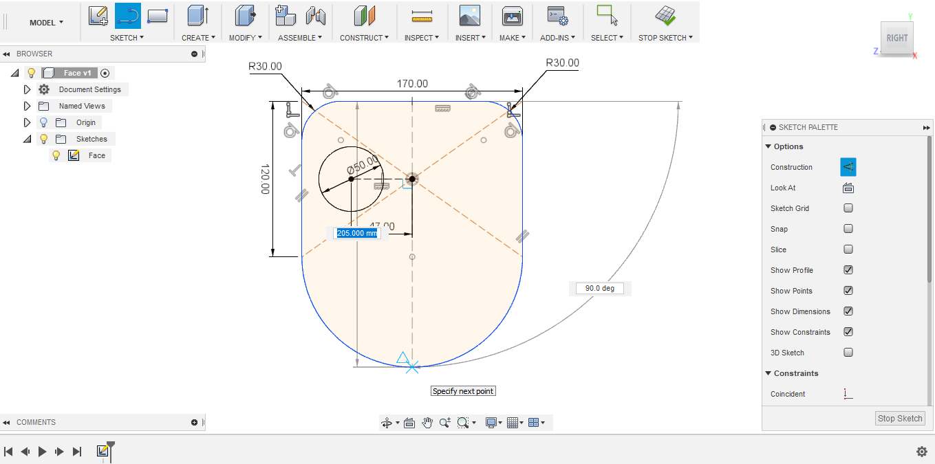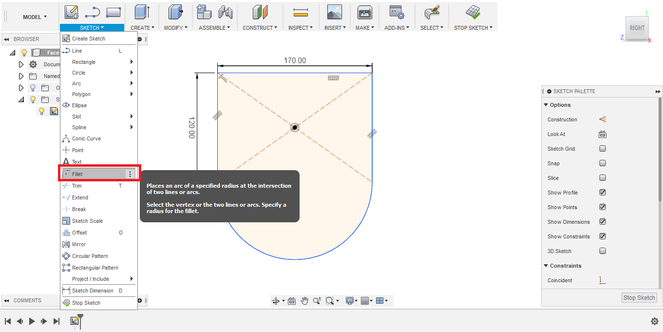 - To smooth sharp corners, I used the fillet tool, which is a curvature of a certain radius between two lines. In this case, I set the fillet radius to 20 mm.