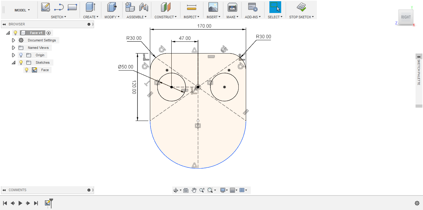 - Now, I moved on to sketch the eyes openings. I drew a "construction line", which is basically a guiding line for me to place the center point of the eye opening circle. I placed the first point of the line at the center point of the rectangle that I created earlier and second point at 47 mm distance from first point, considering I want the eyes to be 94 mm apart (from center to center).