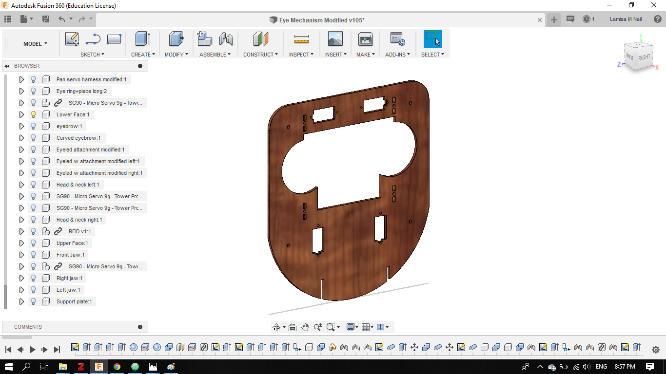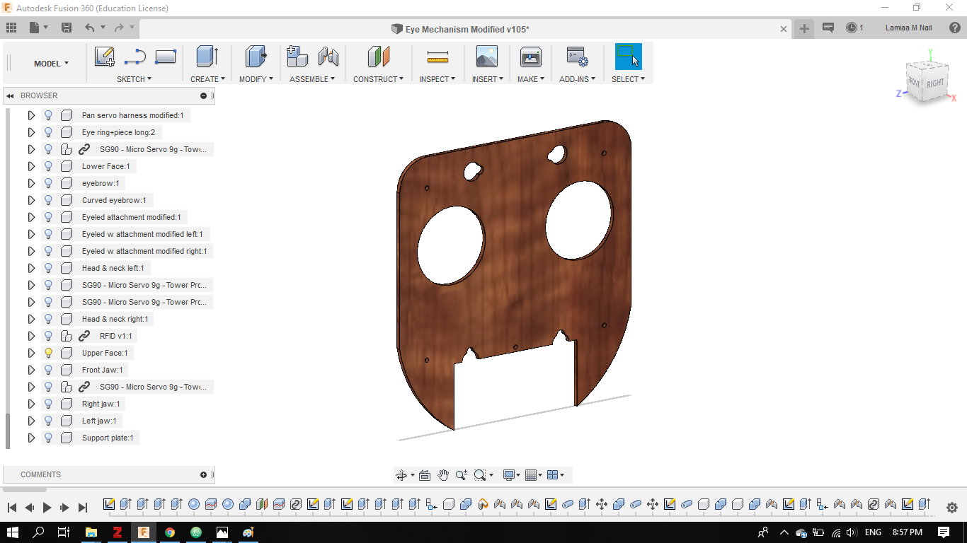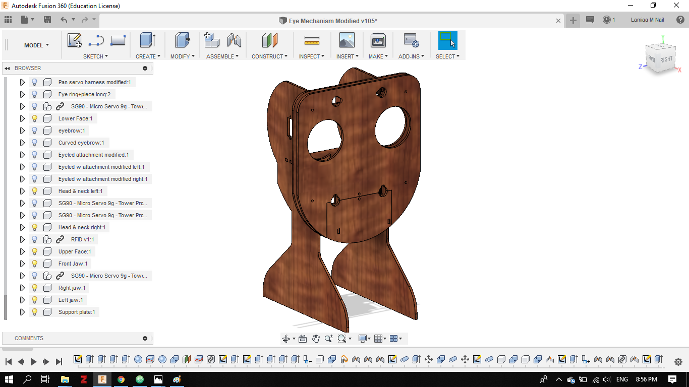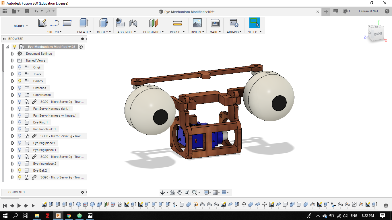 - Later on in my final project development phase I completed the entire Eye tilt and pan mechanism, using a combination of 2D and 3D design using Fusion 360.