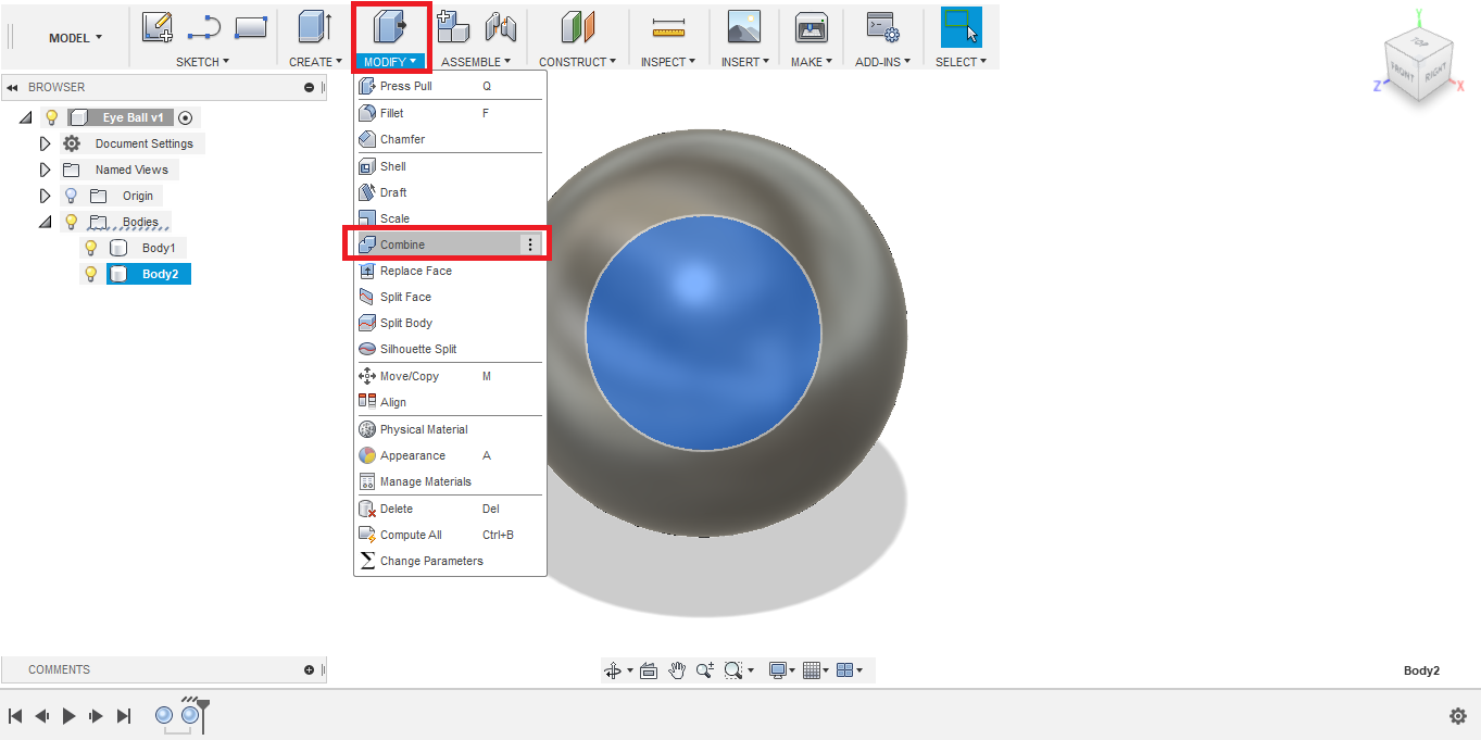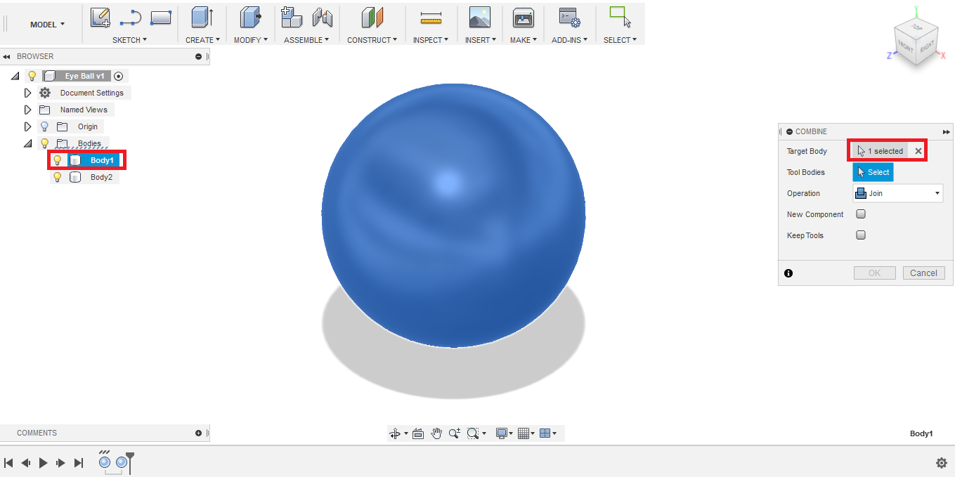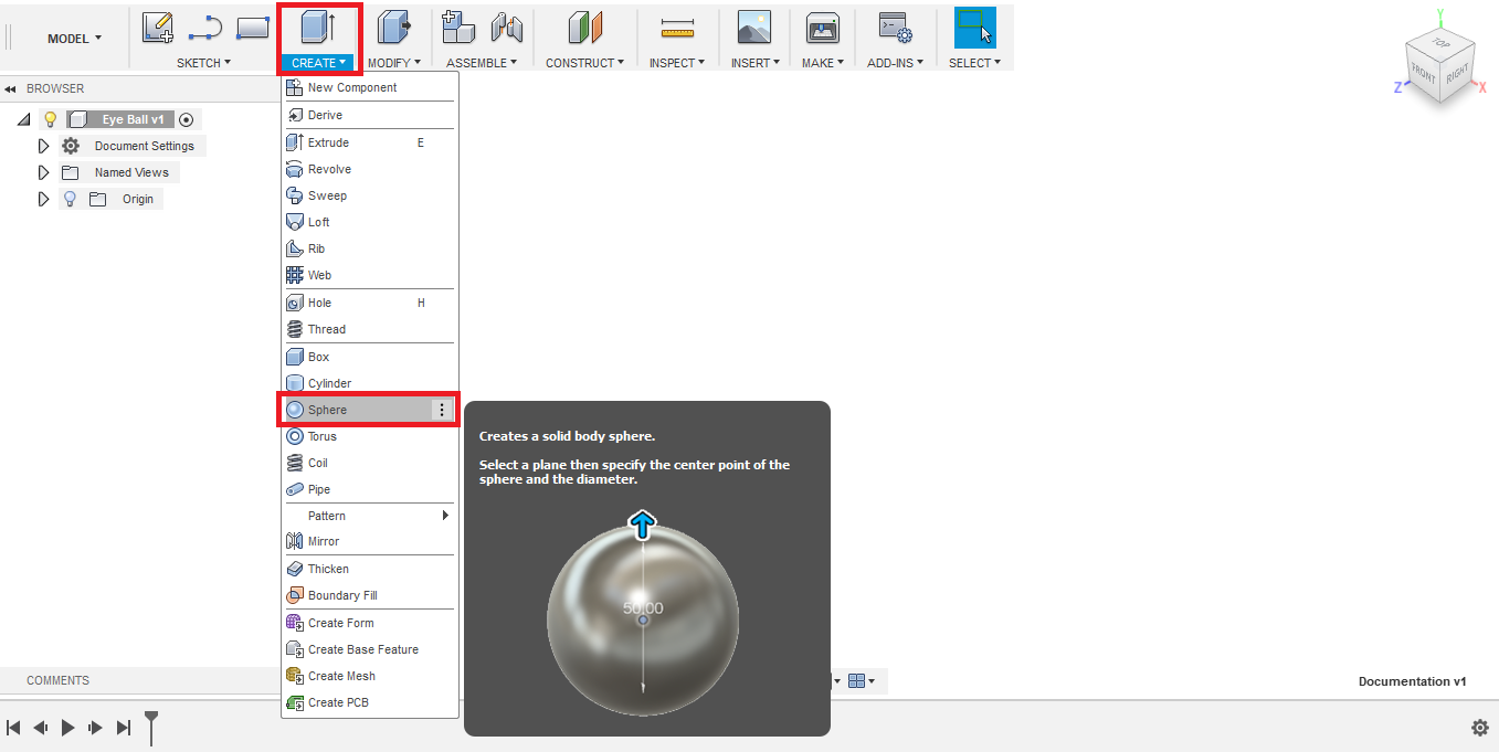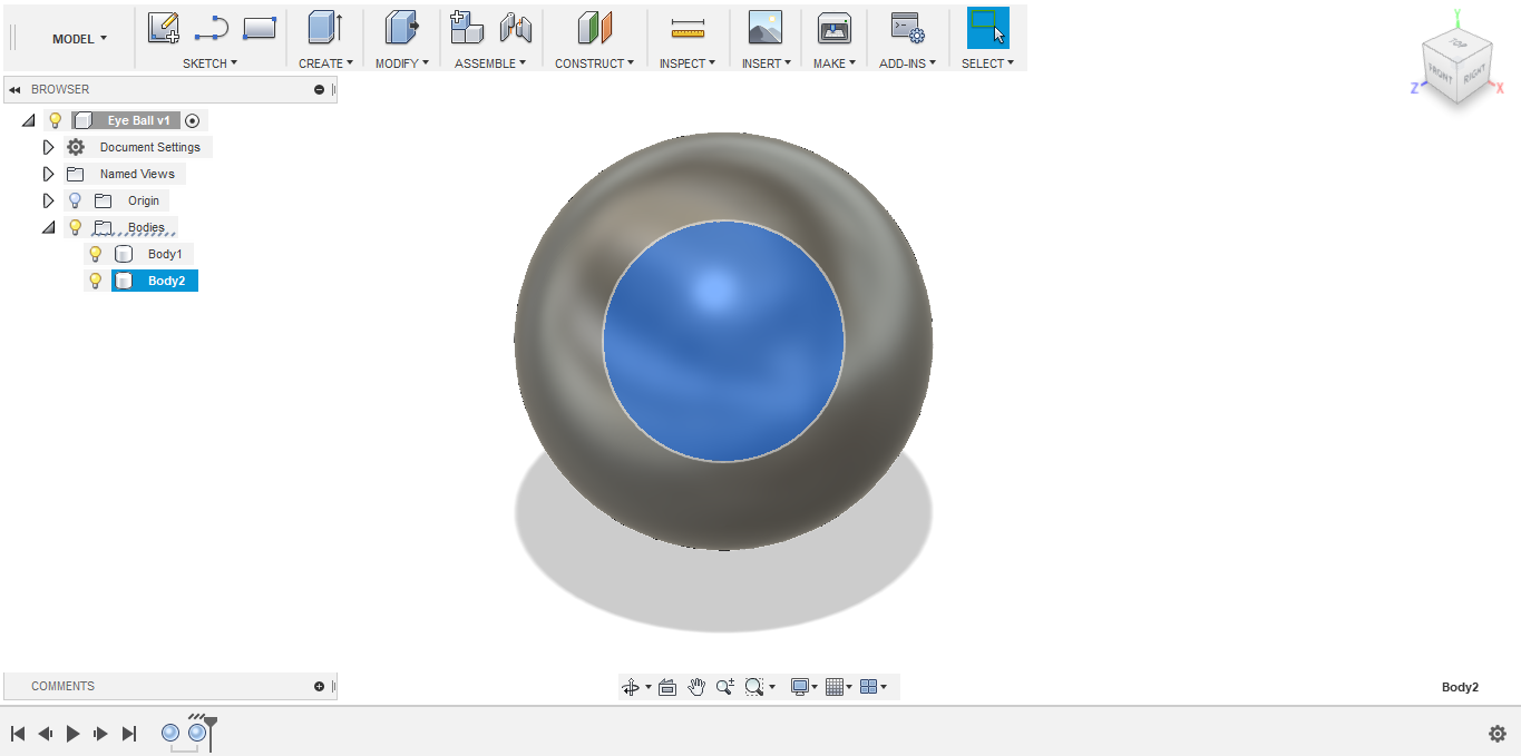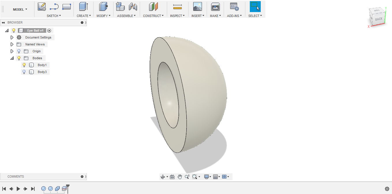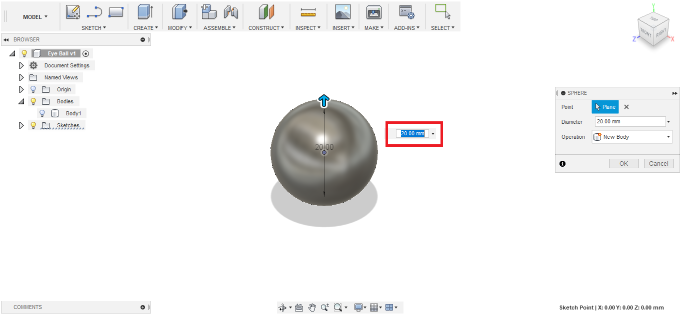 - I'm planning to fabricate the eyes using 3D printing, so to save printing material, I decided to hollow the eye structure from the inside. To do so, I created another smaller sphere, with 20 mm diameter, with its center located at the center of the bigger sphere.