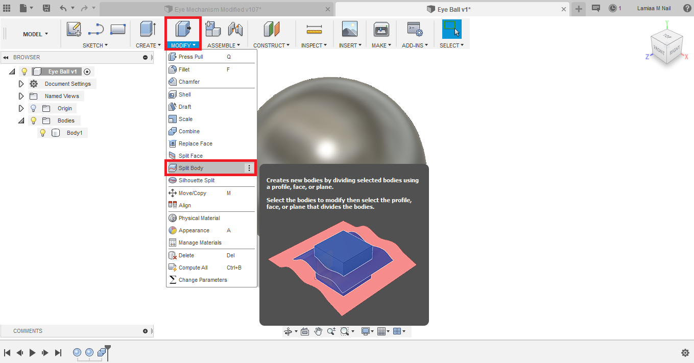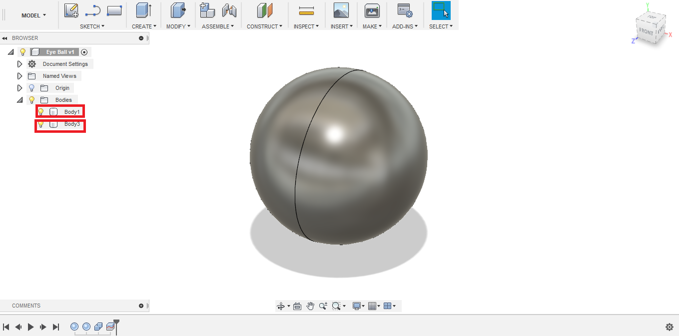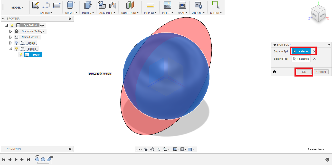 - I don't need the entire sphere to simulate the eyeball, only one half is needed. So I used the Split tool.