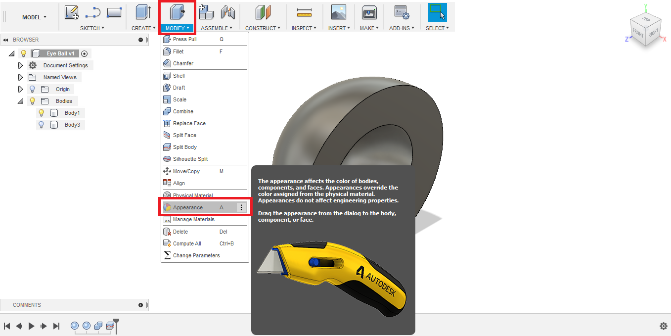 - To give it the physical appearace of the an eye, I used the Appearance tool.