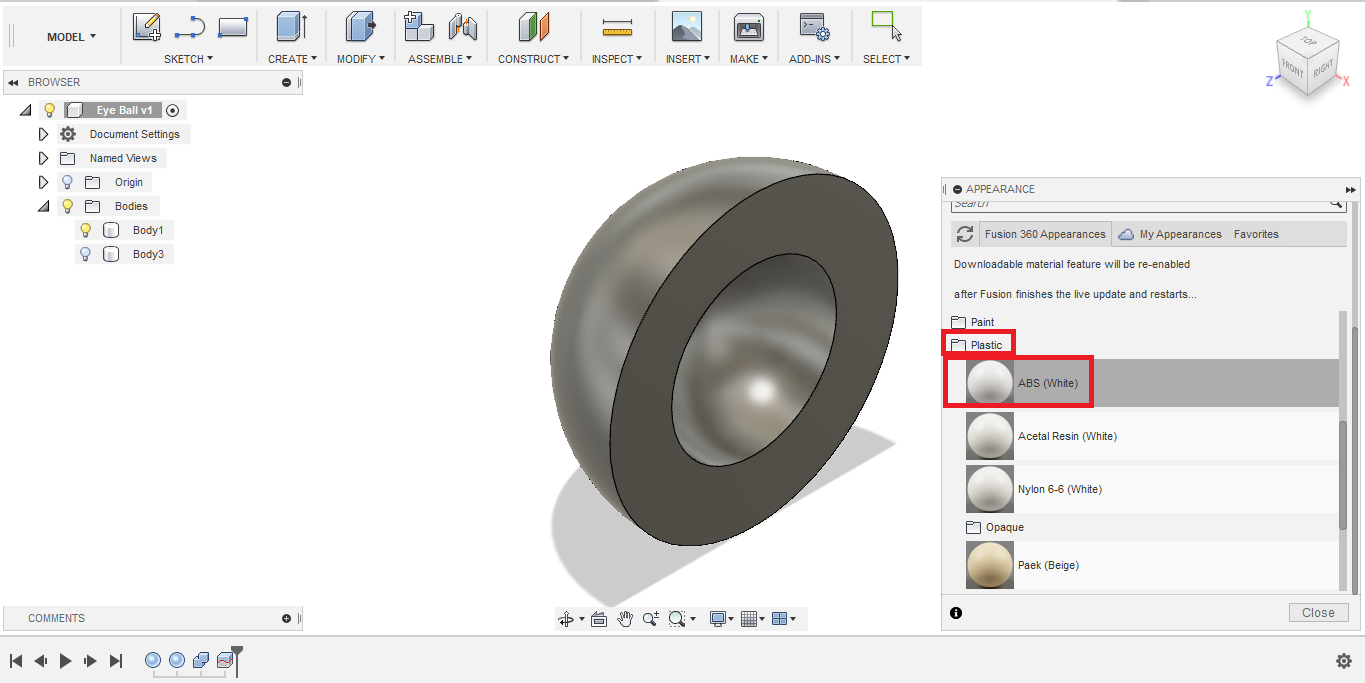 - I browsed the materials library, from Plastics, I dragged the ABS white and dropped on the 3D object.