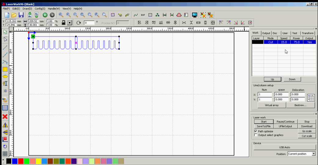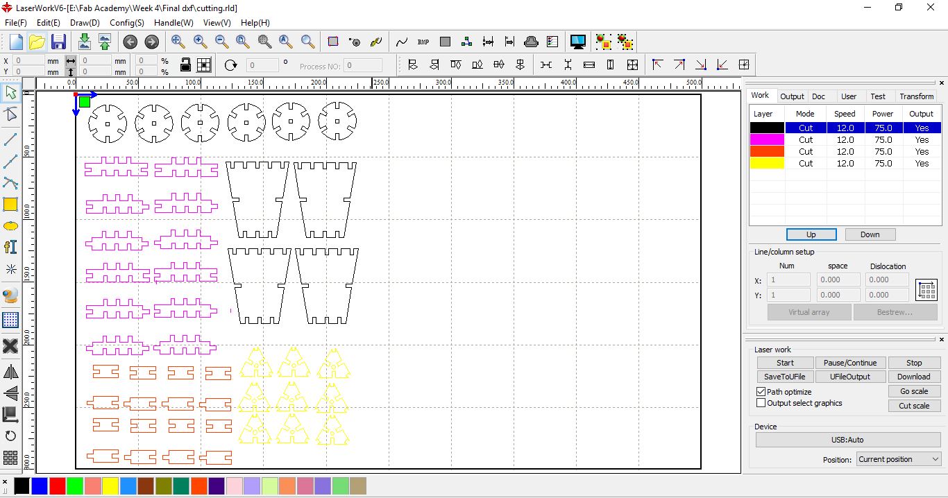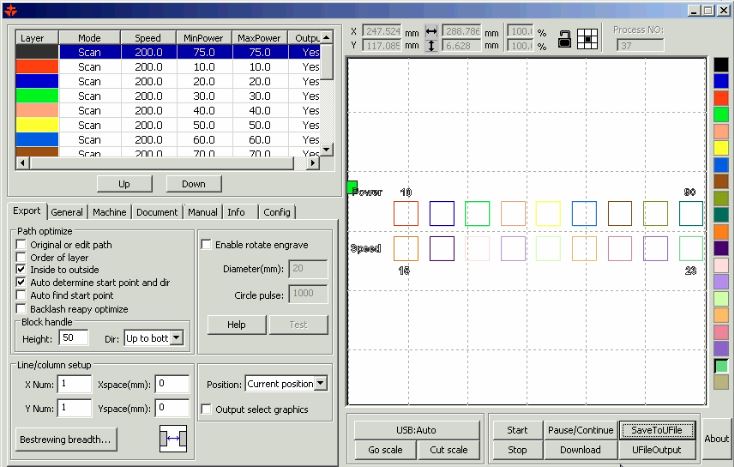 - Using Laserworks V6, we were able to set the power and speed for the squares, each of which is indicated with a different color for visualization. We set the mode to cut for cutting, and scan for engraving.