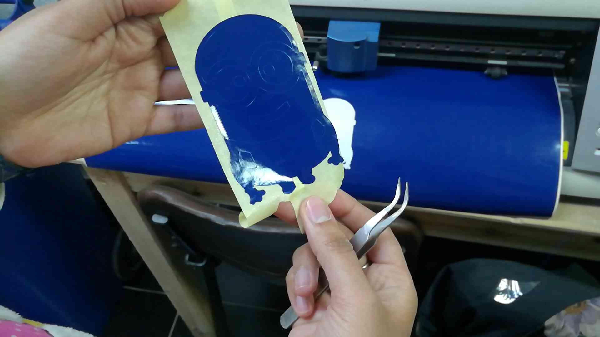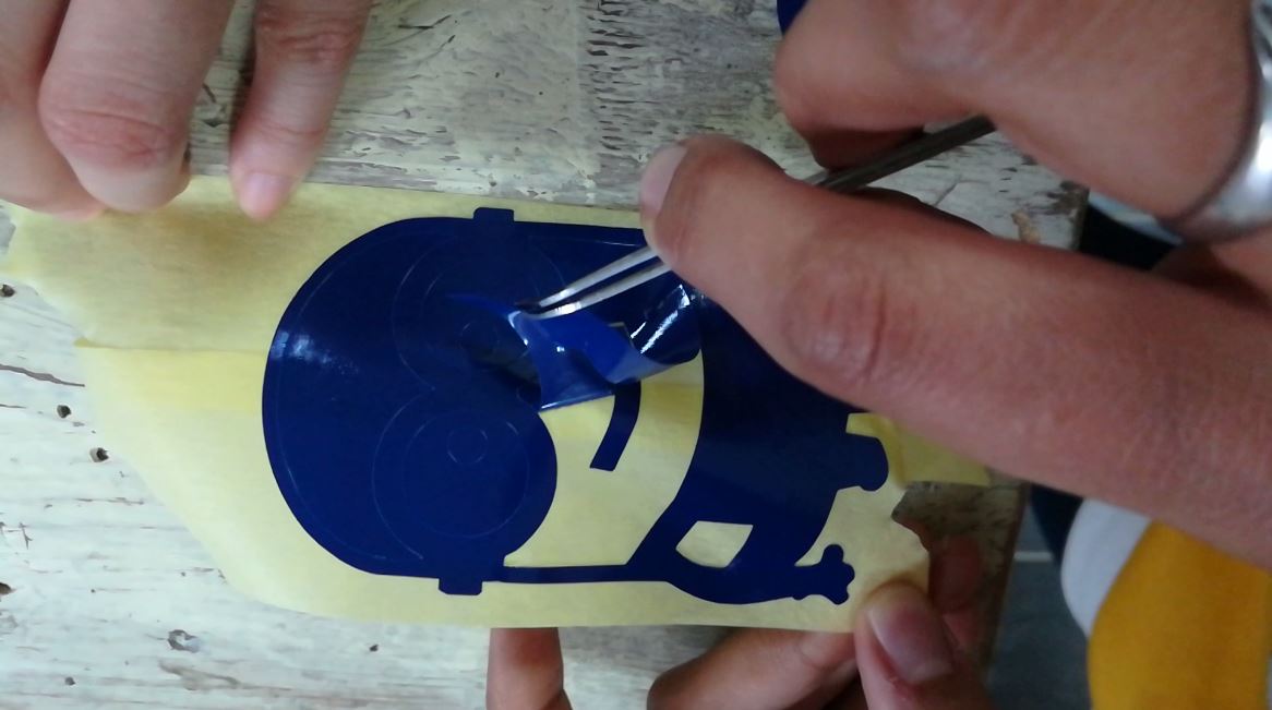 - After the vinyl cutting machine finishes the cutting process, I apply tape on the surface of the cut area then I peel it very slowly.