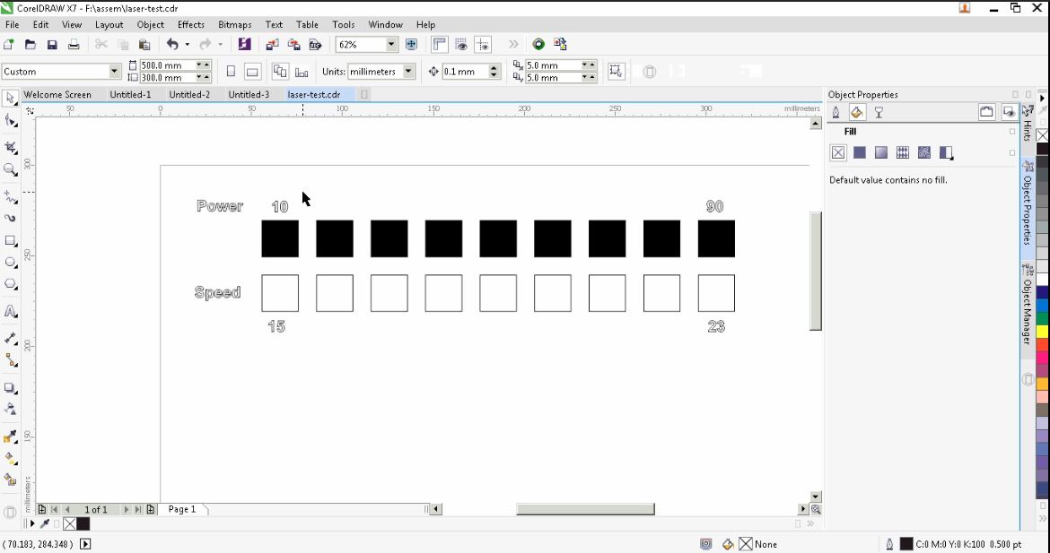The template consists of small 20x20 mm squares. Each square is set to a certain cutting/engraving speed and power. The first row of squares is set for engraving with a constant speed of 200 mm/s, and the power starts with 10% and increases by 10 for every next square, reaching 80% by the last one.