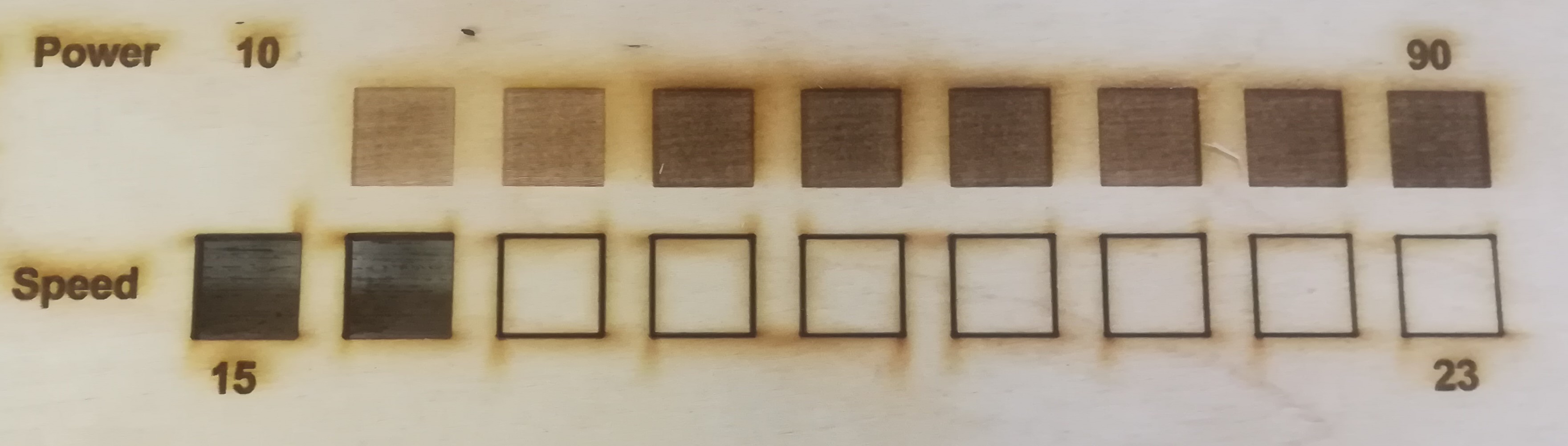 The two parameters under test here are the cutting/engraving power and the cutting/engraving speed.