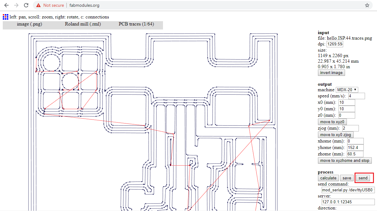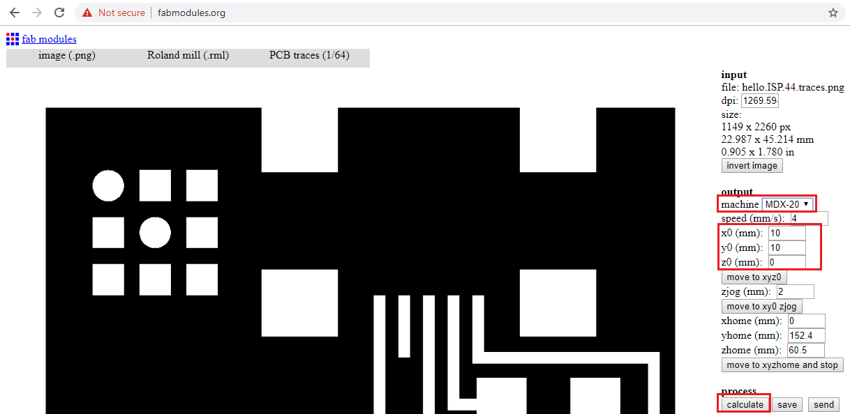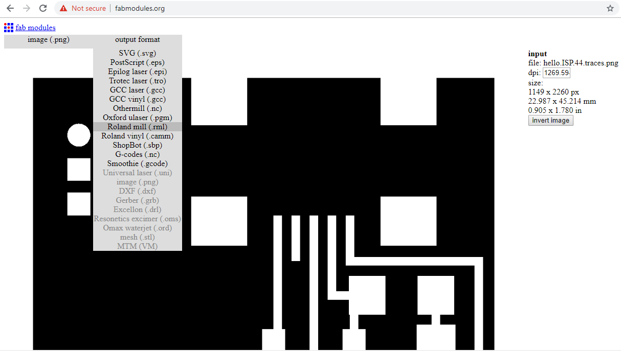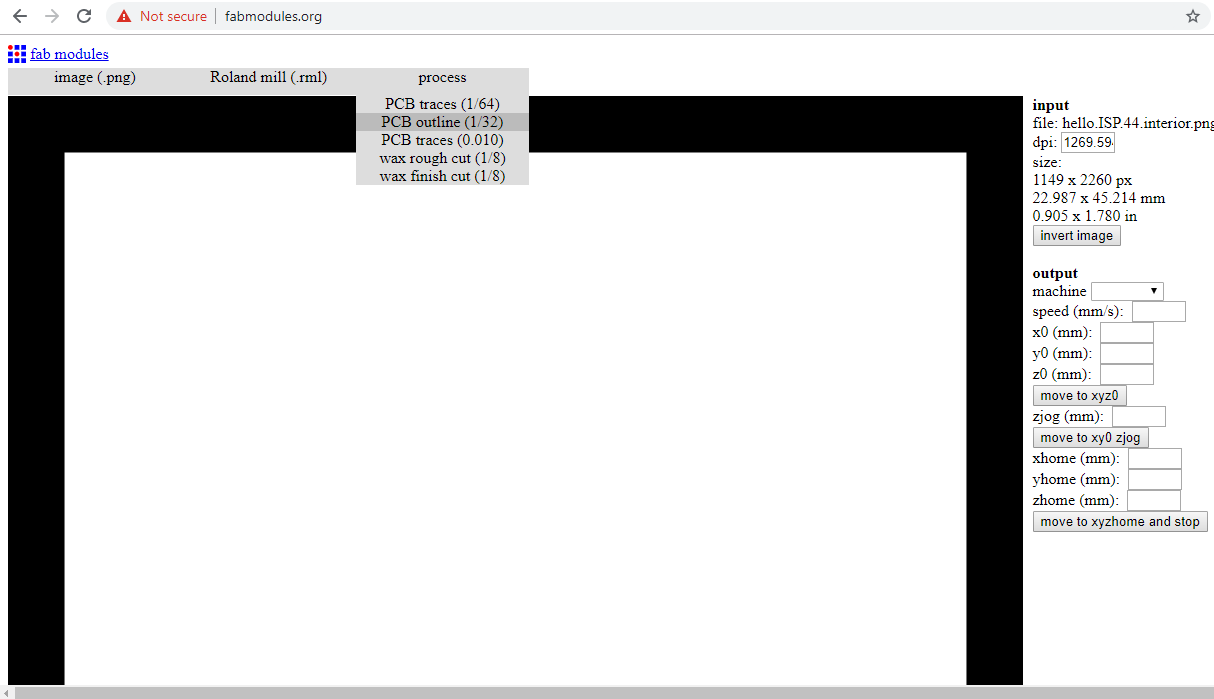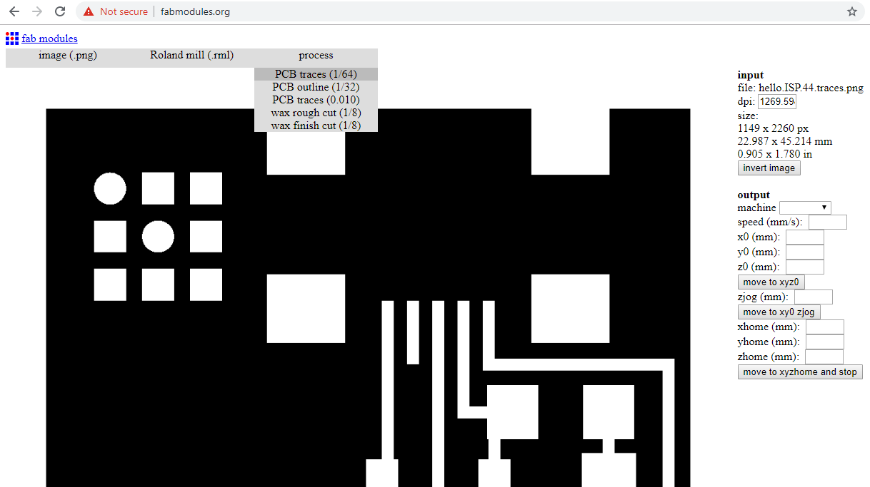 To generate the toolpath for milling, I used Fab Modules. First, I imported the traces image, the image is in PNG format, with only black and white lines.