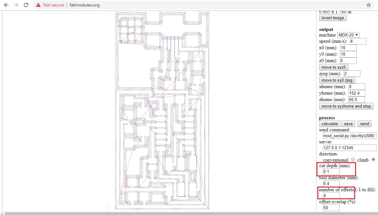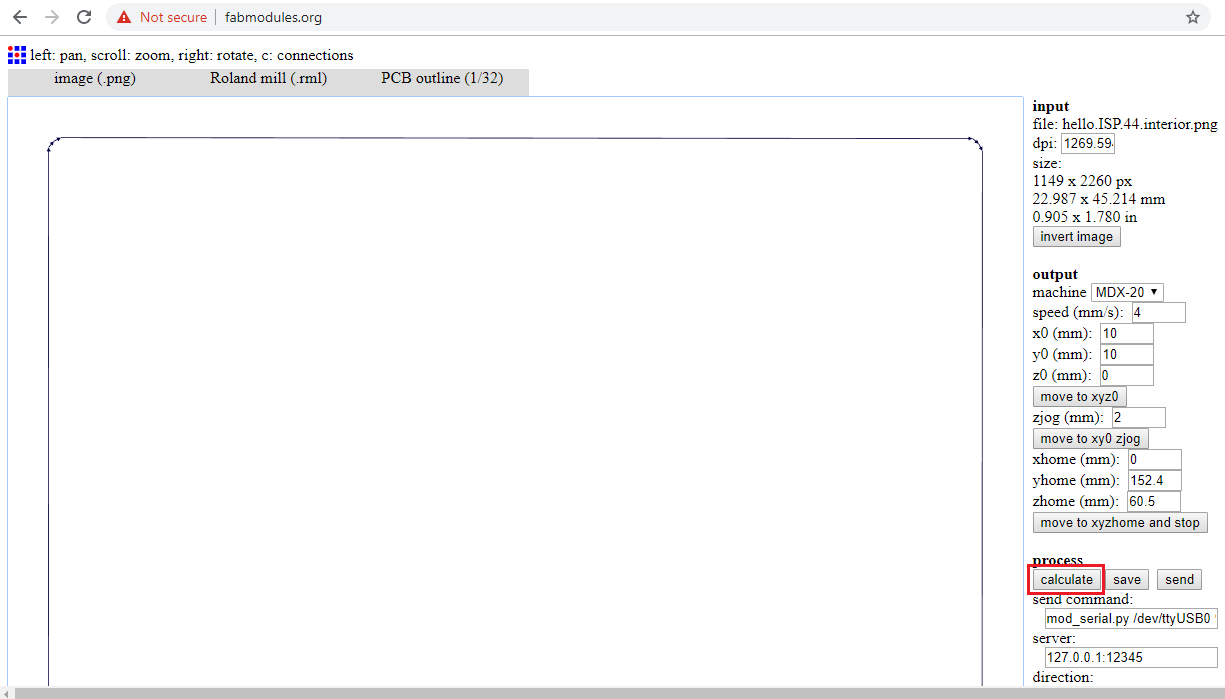Now, I need to choose the machine's model I'm using for milling, which is MDX-20. I also need to zero point of the endmill by adjusting the values of the X & Y, while observing the position of the endmill while it changes its position over the PBC surface until it reaches the desired position. I finally press calculate to generate the toolpath.