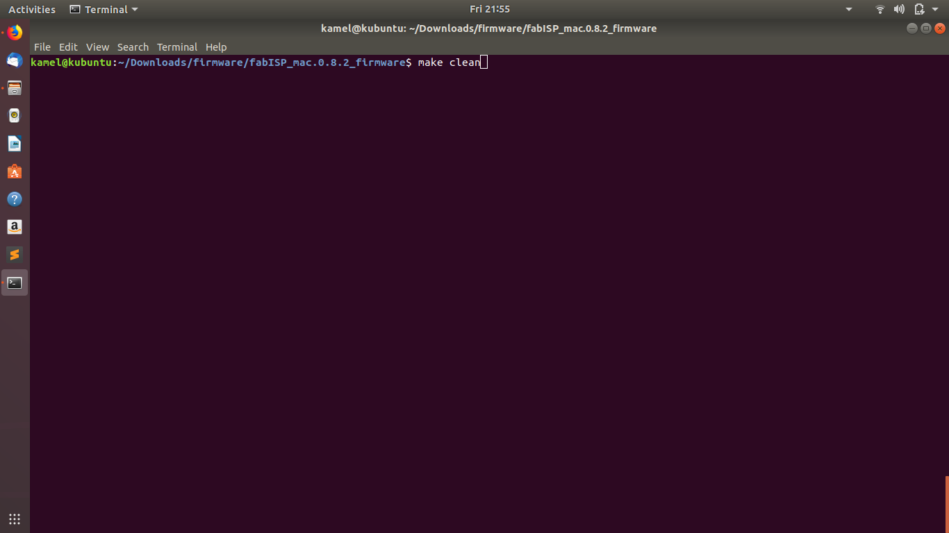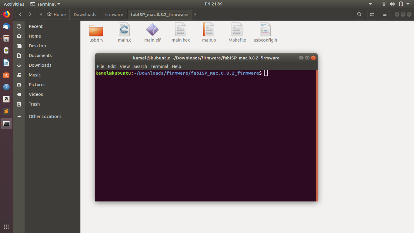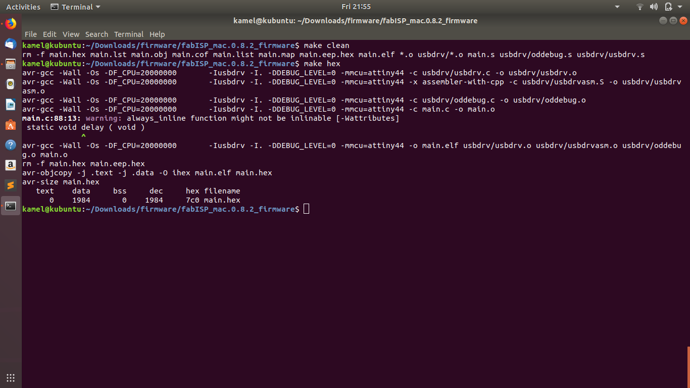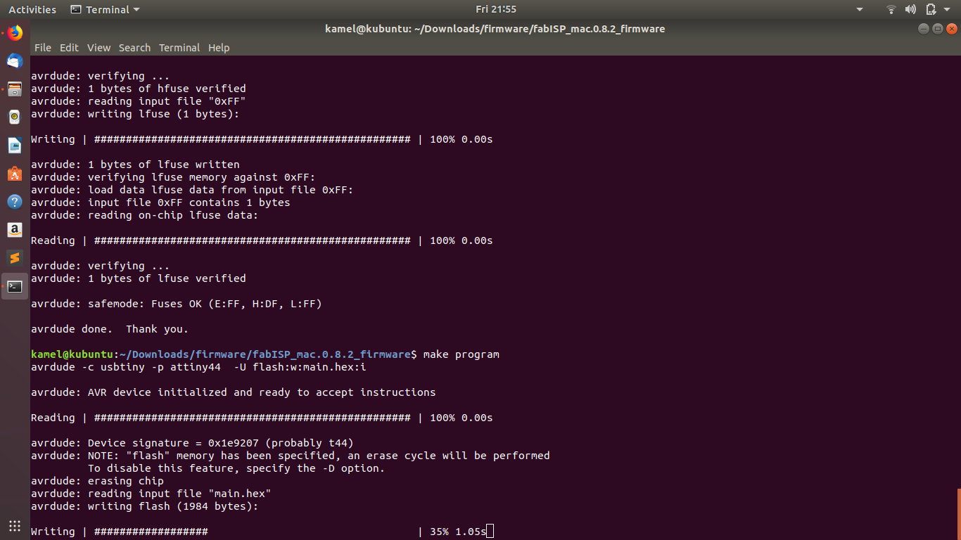I used a computer with an Ubuntu operating system for programming. AVRdude was already installed. I just downloaded the FabISB firmware, unzipped it and opened the terminal in the firmware directory where the C file, hex file and make file are located.