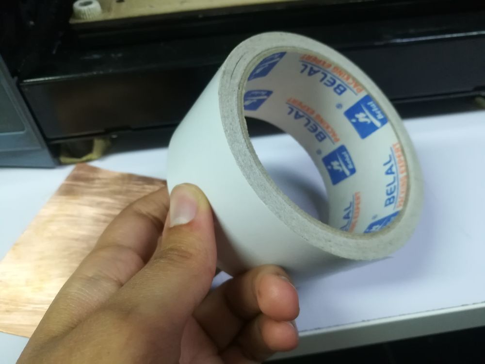 Second, we fix the PCB to the milling machine plate use double sided tape. We need to make sure that the tape layer is smooth with no wrinkles so that the entire surface of the PCB have one fixed height relative to the end mill.